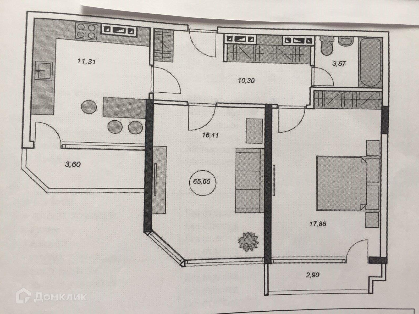 Квартира очень удачной планировки. Кухня 11,31 кв.м, спальня 17,86 кв.м, гостиная 16,11 кв.м, с/у 3,57 кв.м, прихожая 10,30 кв.м, лоджия на кухне 3.60 кв.м, лоджия в спальне 2,90 кв.м.