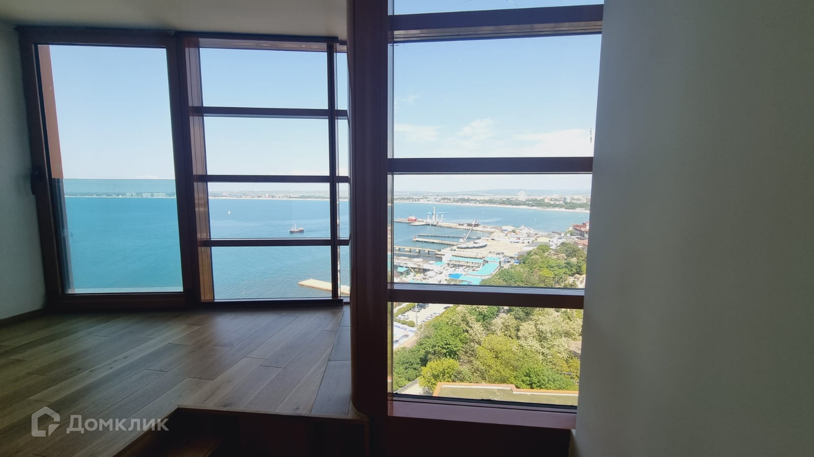 В квартире одна спальня, один совмещенный санузел, гостиная, кухня-столовая 35 кв.м., гардеробная. Прямой панорамный вид на море со всех окон.
