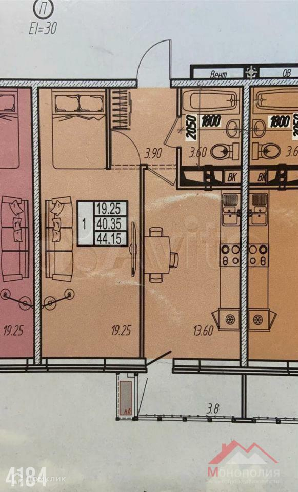 Общая площадь 44.2 м2