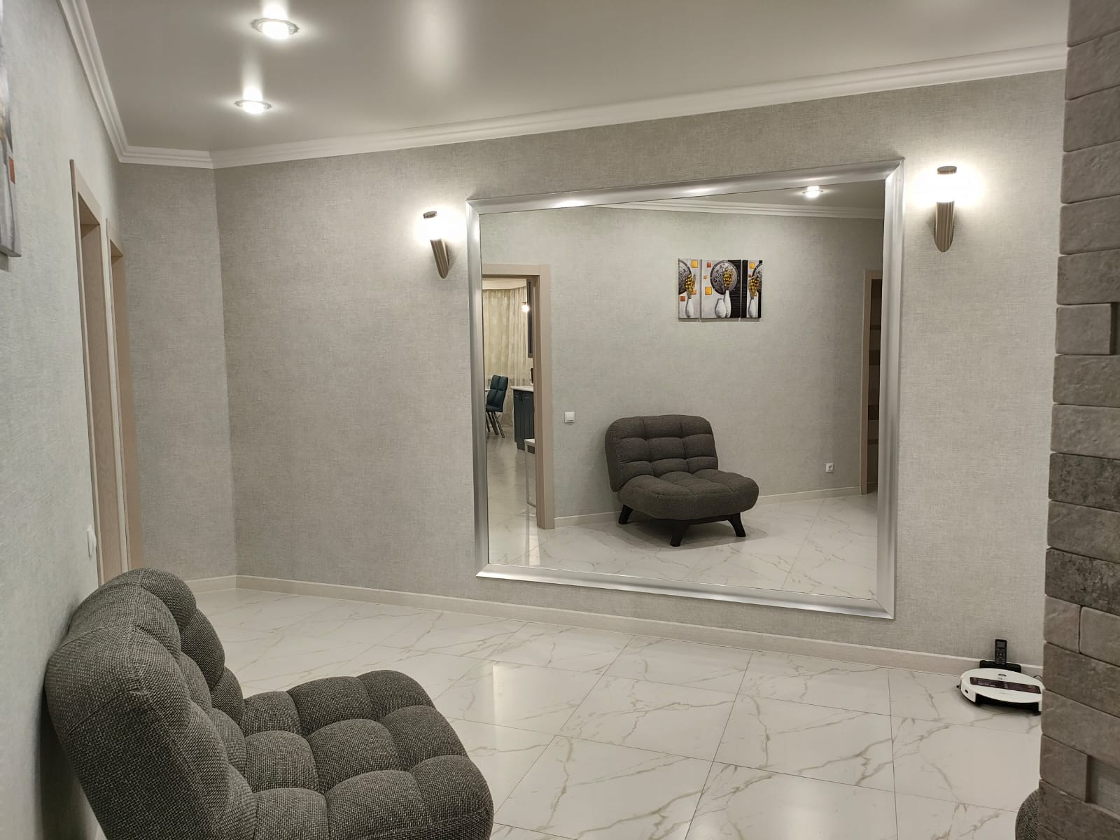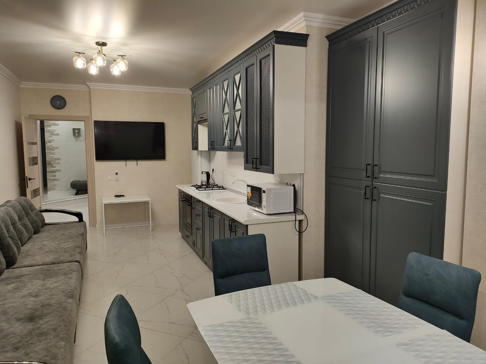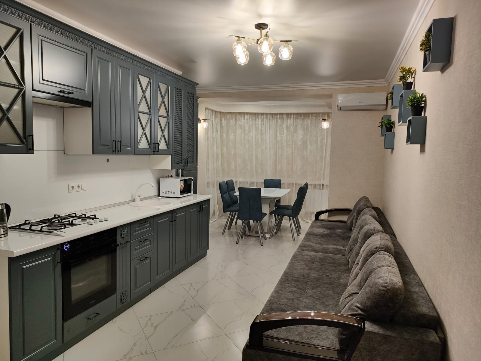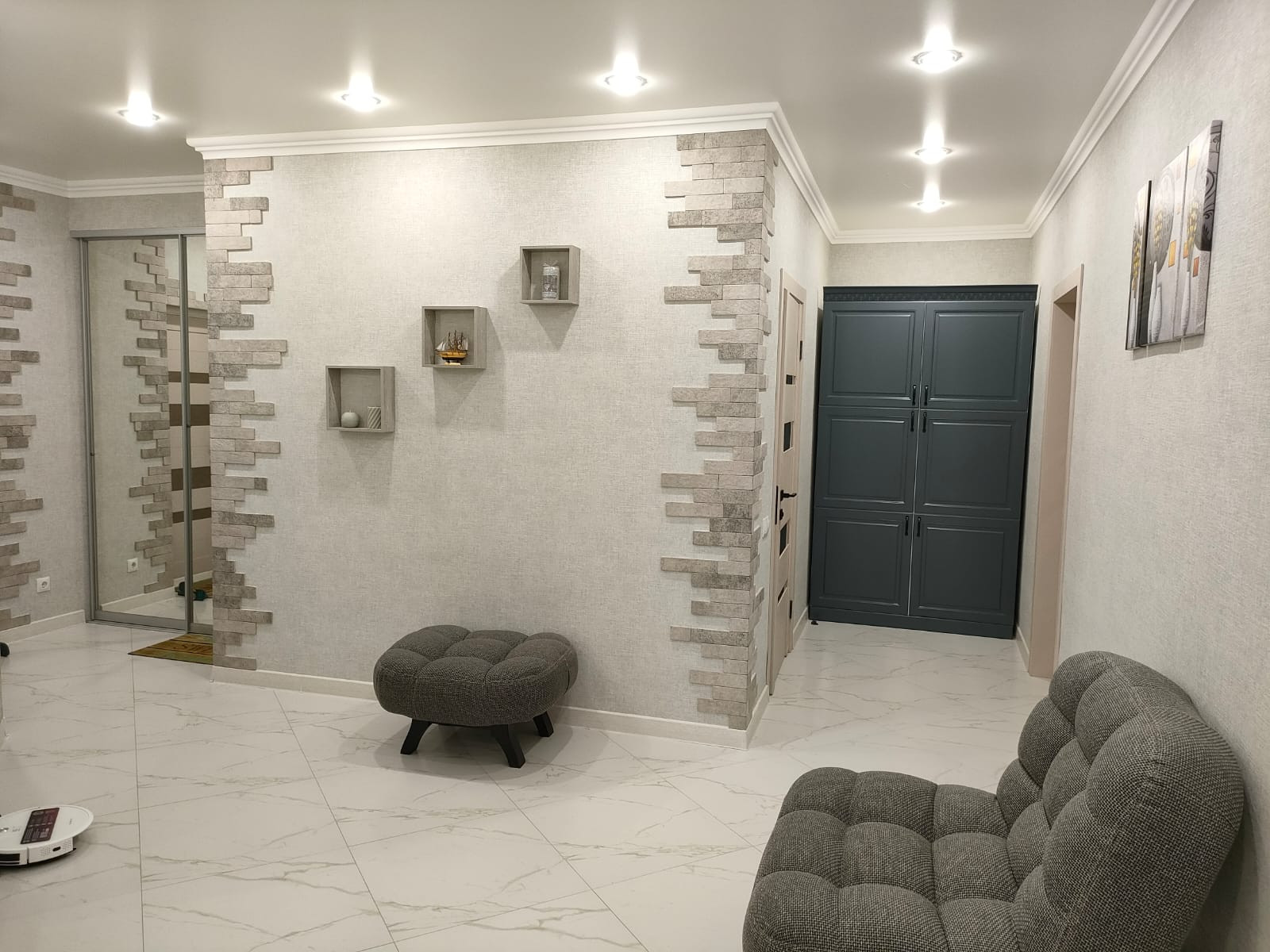 В квартире выполнен качественный ремонт ,. Общая площадь квартиры-102кв м, просторный холл-19м, кухня-гостиная- 25м, спальня -16м и еще одна комната - 30 м, с/у -6м, а так же гардеробная -6 м. Практически во всей квартире сделан теплый пол( холл, кухня-гостиная, с/у. При продаже в квартире остается мебель и техника, как на фото, Вся мебель и техника качественных производителей, так же как и материалы, которые использовались при ремонте.
