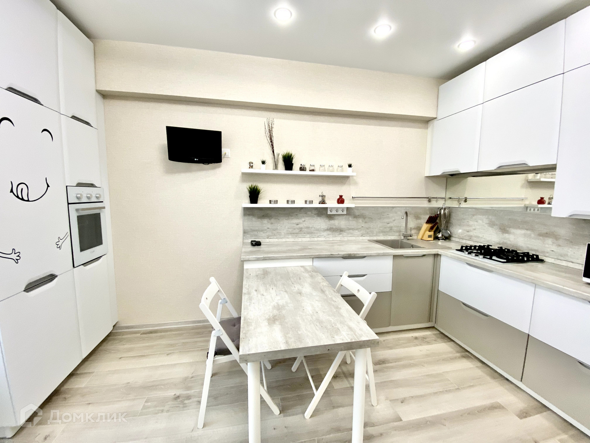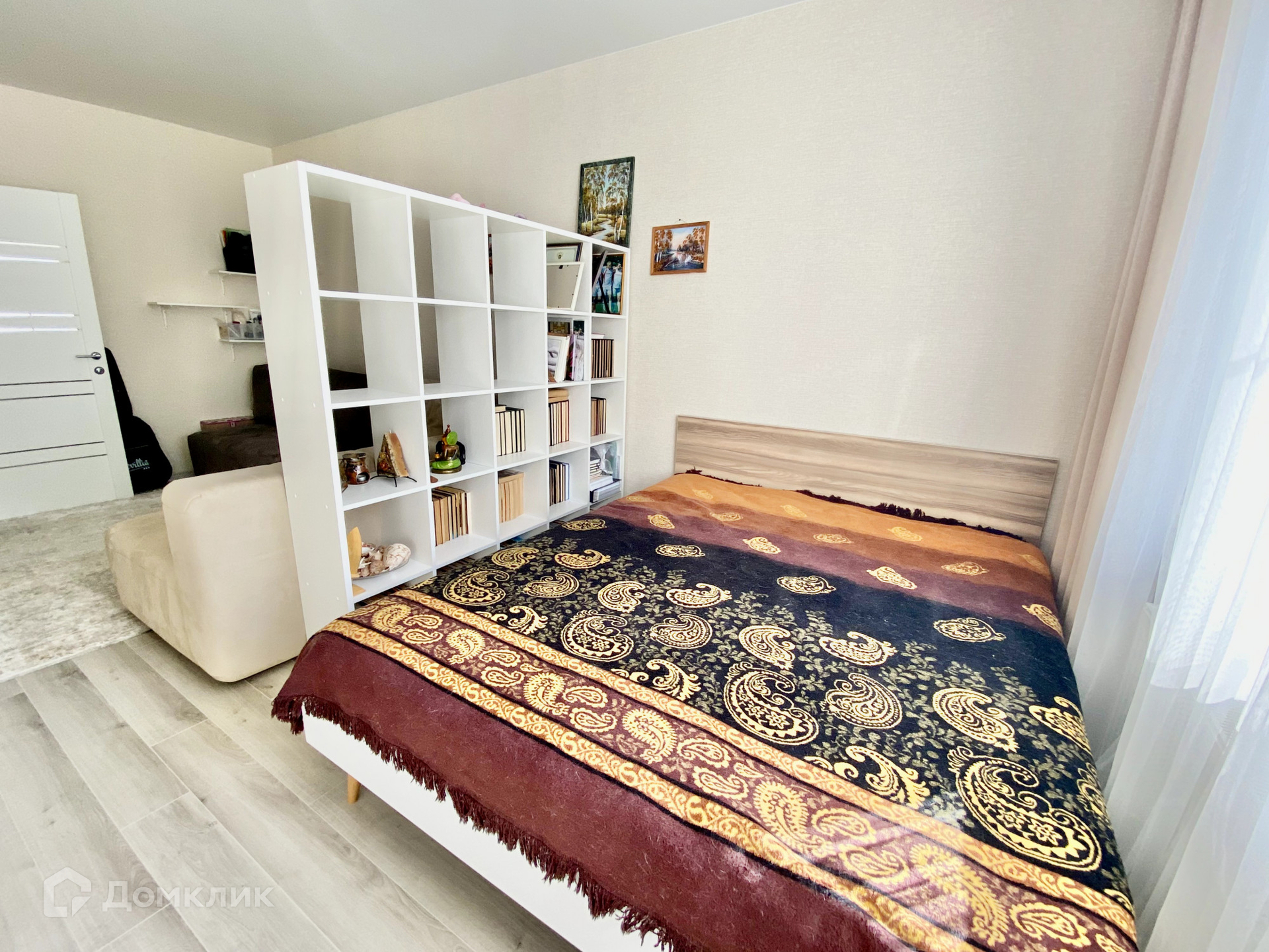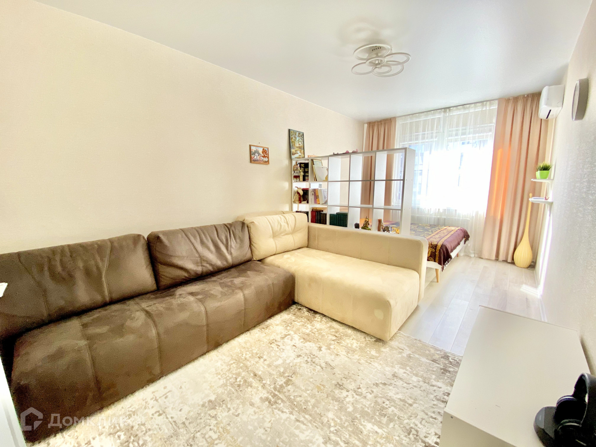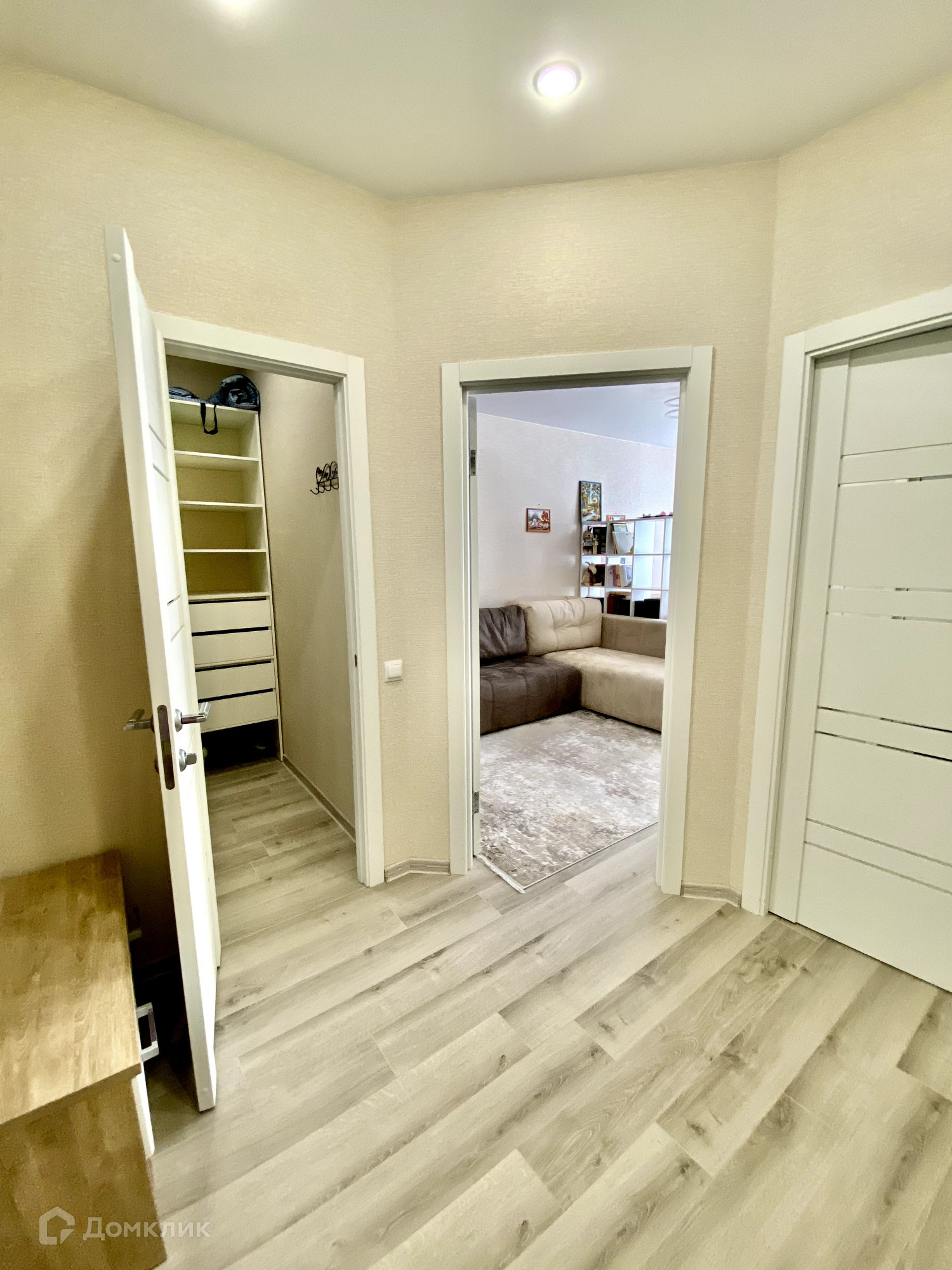 В гостиной квартиры созданы две функциональные зоны, что позволяет максимально эффективно использовать пространство. Кроме того, есть большая гардеробная площадью 2,8 квадратных метра со встроенными шкафами для хранения.