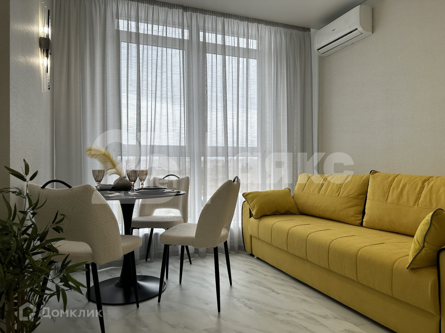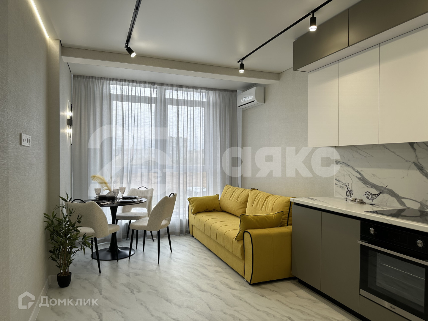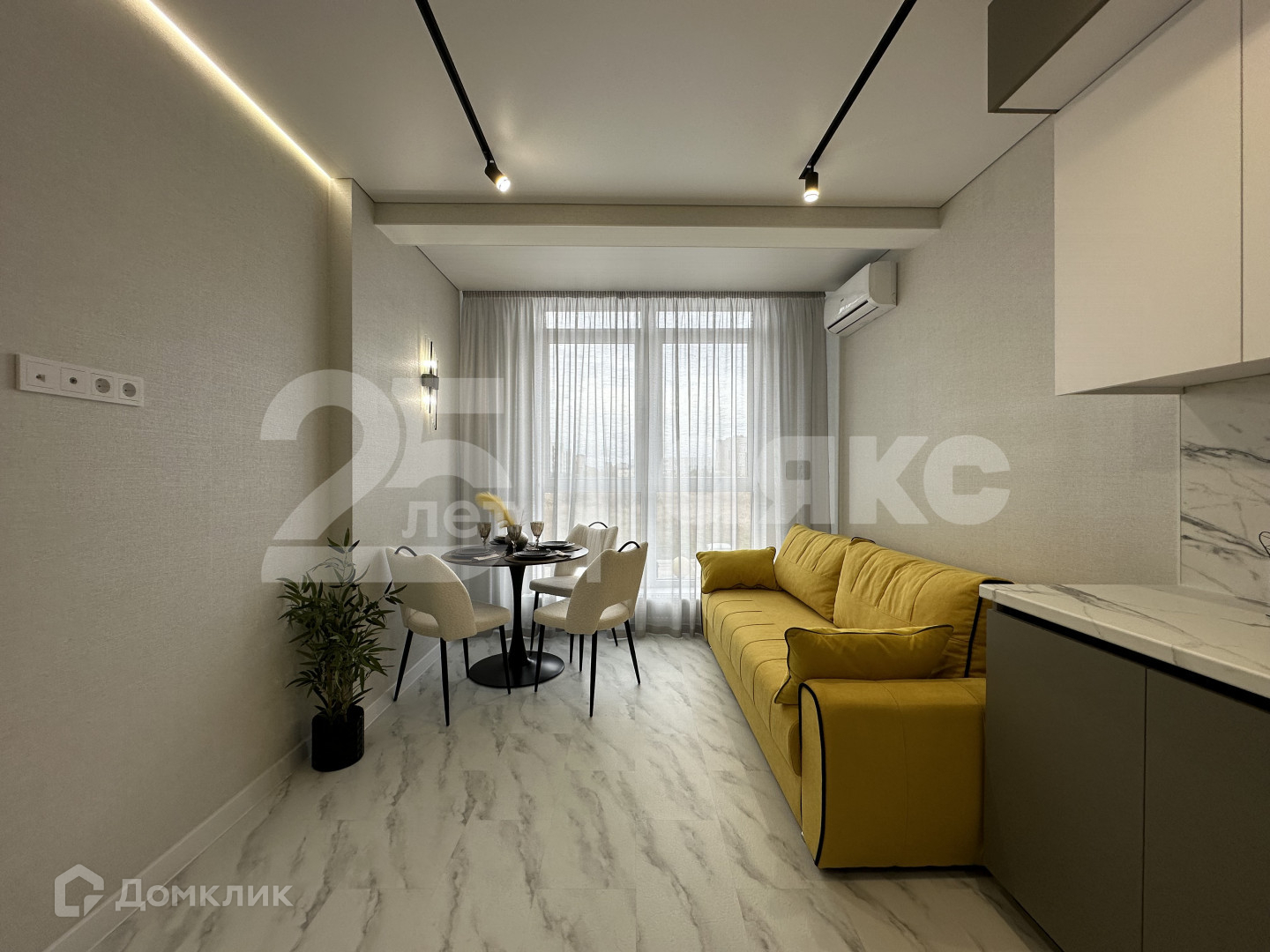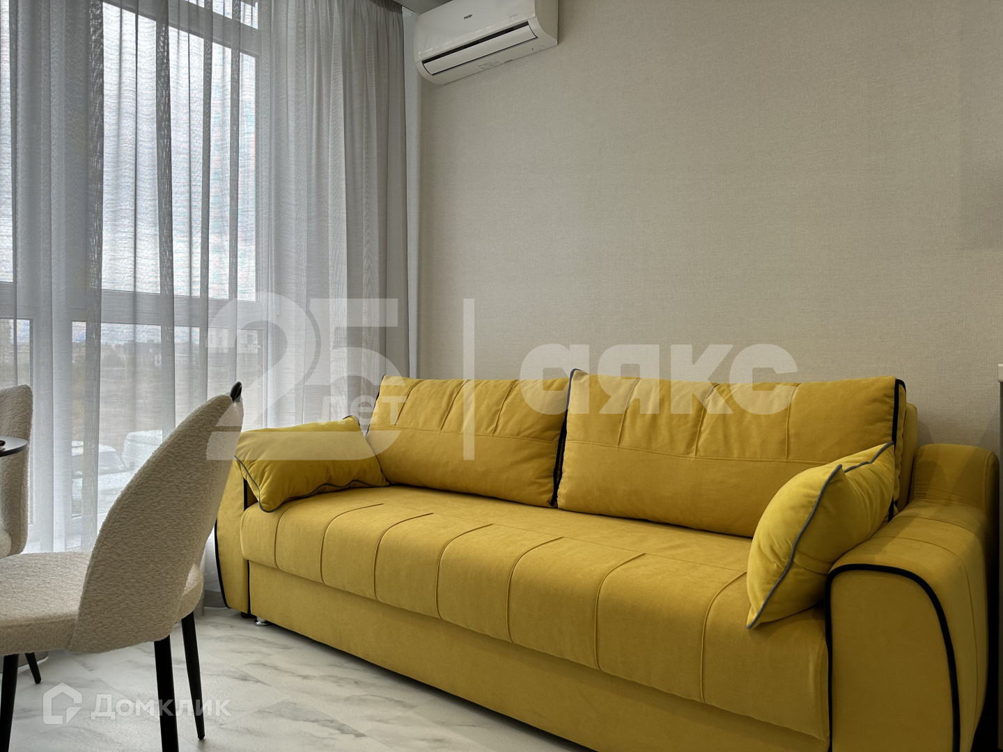 Просторная жилая комната с мебелью, установлен кондиционер, включая кухню.