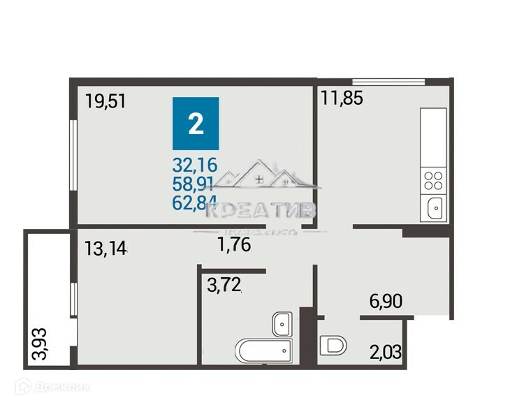 Общая площадь 62.8 м2