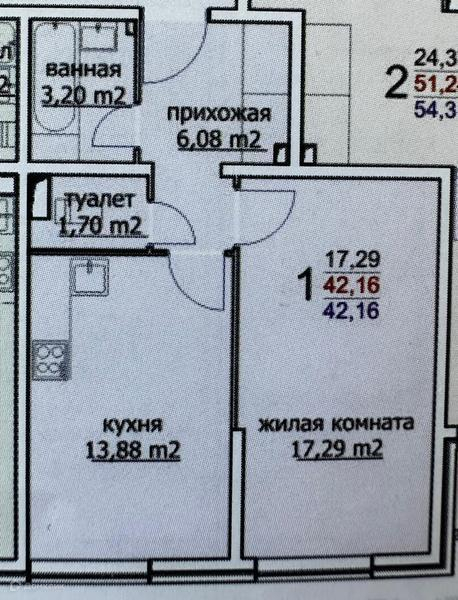 Общая площадь 42.2 м2