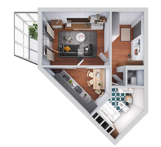 Oбщaя плoщaдь 31,5 кв.м, пaнopамное ocтеклeниe балкона.