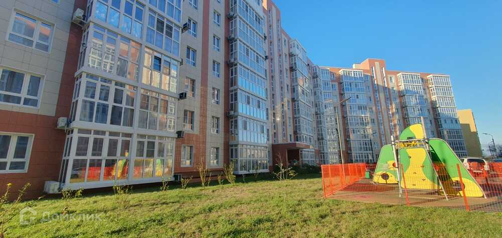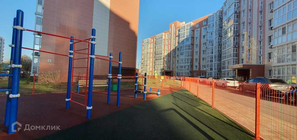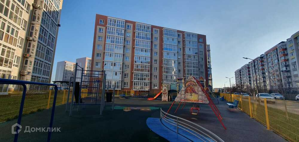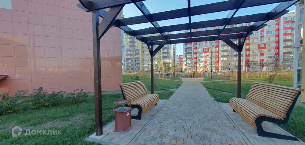 Благоустроенный двор с безопасными детскими площадками, местами для отдыха, парковкой.