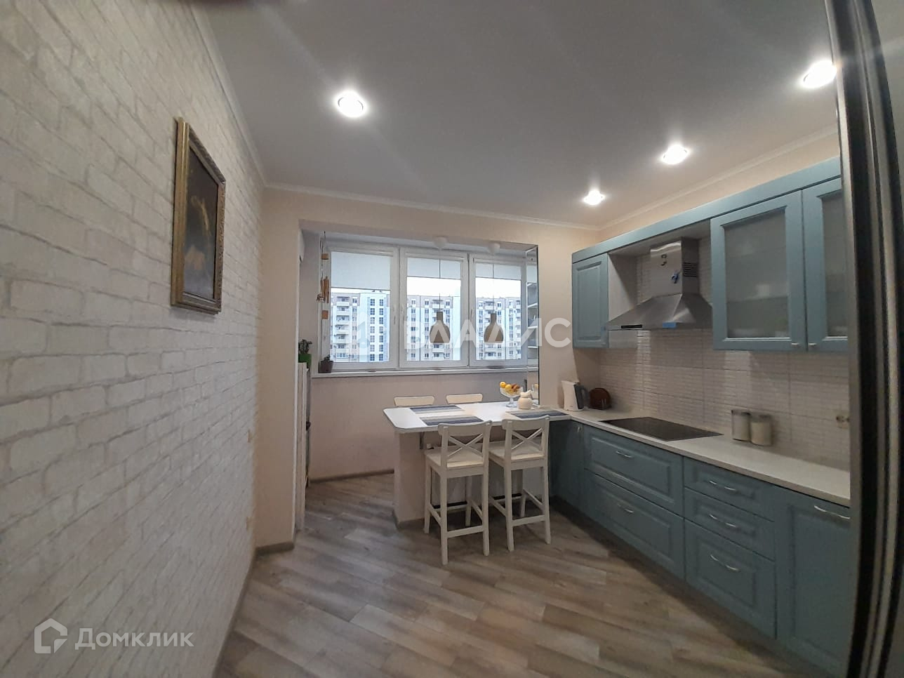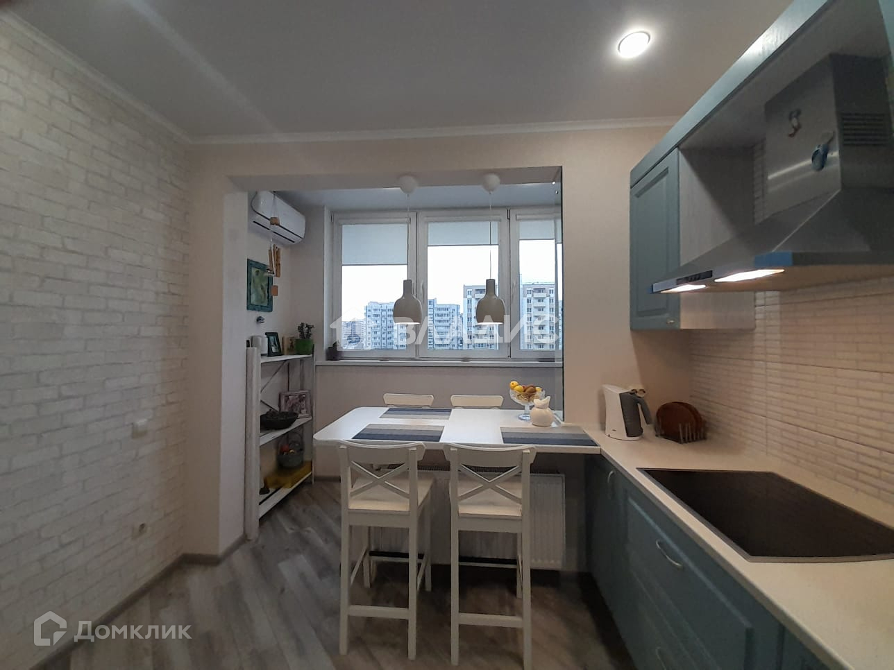 Общая площадь 55.4 кв.м., Просторная кухня гостинная 12.9 кв.м. , совмещена с лоджией.