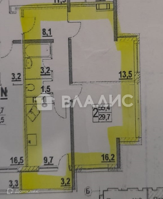 Общая площадь 55.4 м2