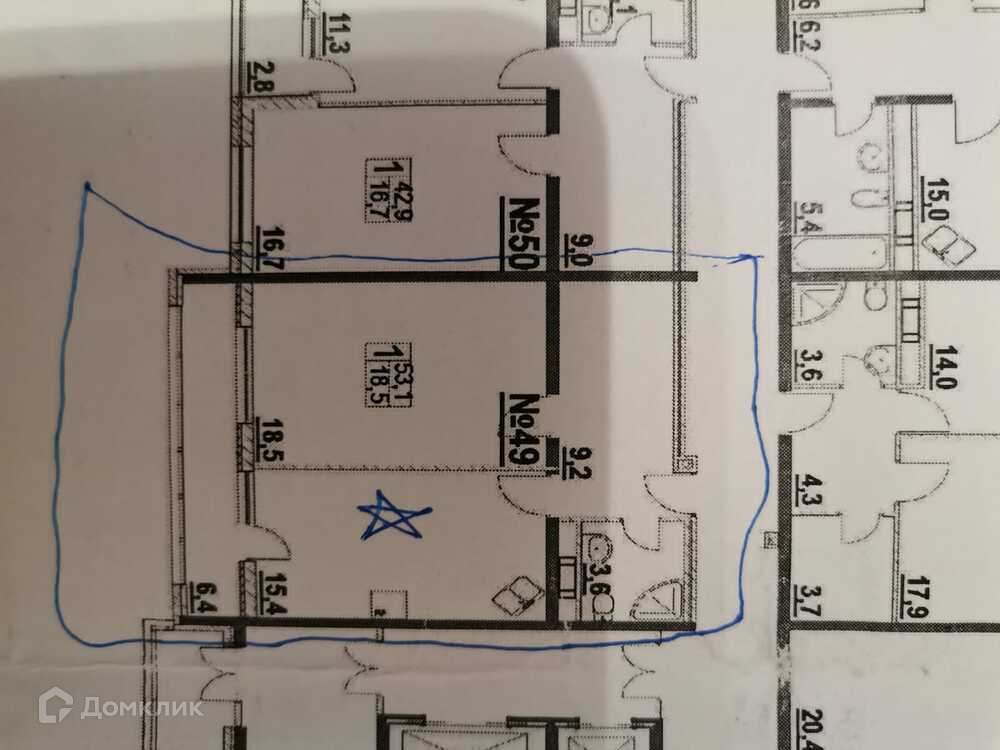 Комната 18,5кв.м, кухня 15,4. Большой балкон 6,4кв.м. Санузел 3,8кв.м.