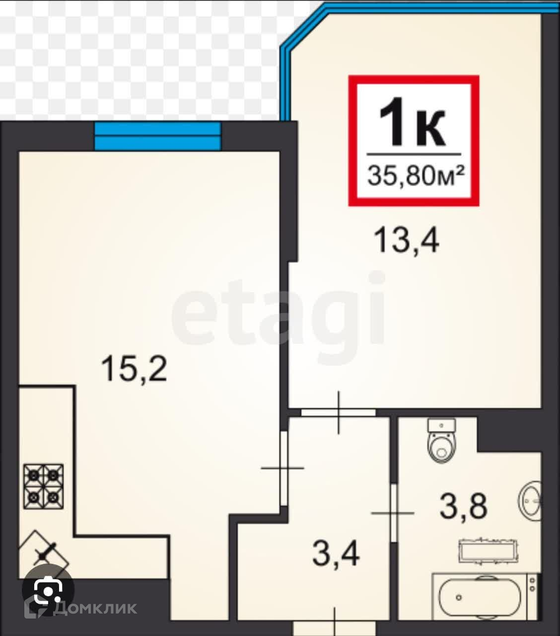 Общая площадь 35.8 м2