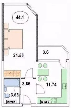 общая площадь 44м2, большая кухня - гостиная 22м2