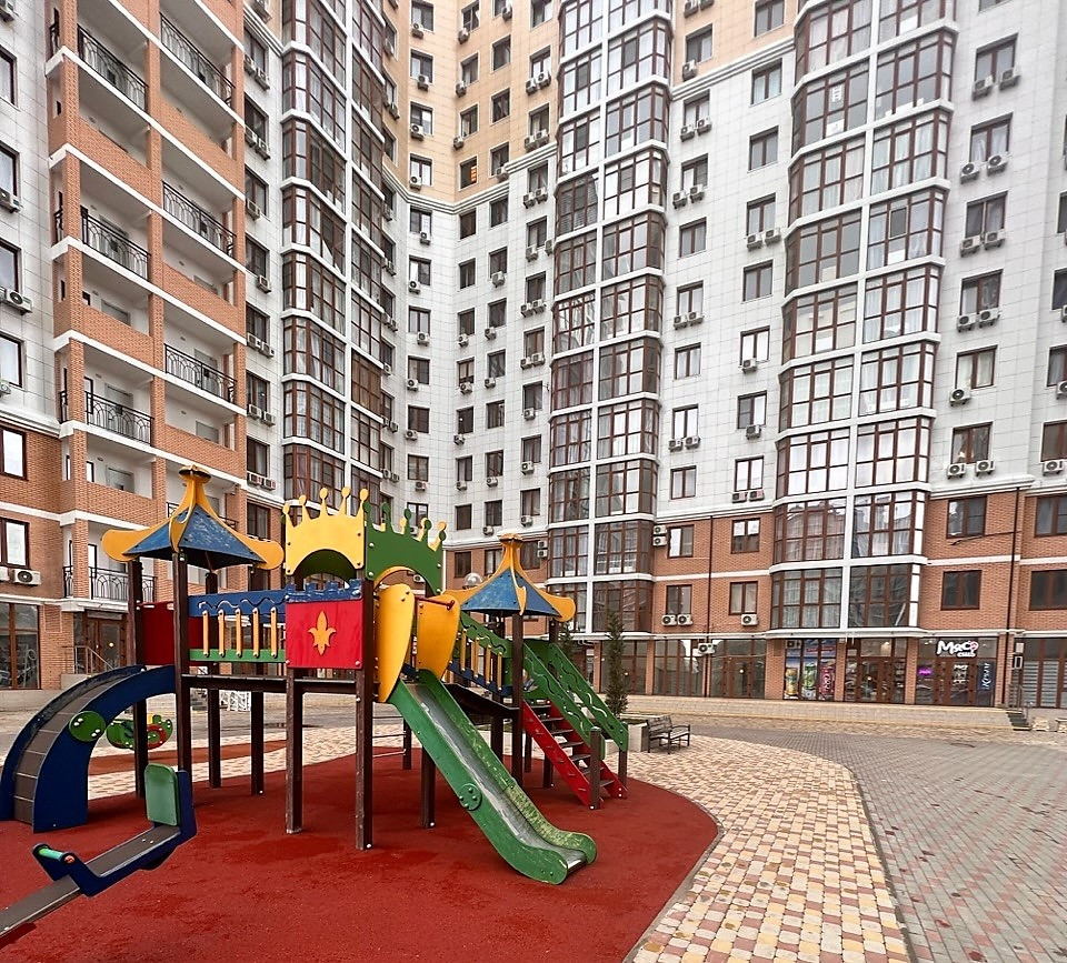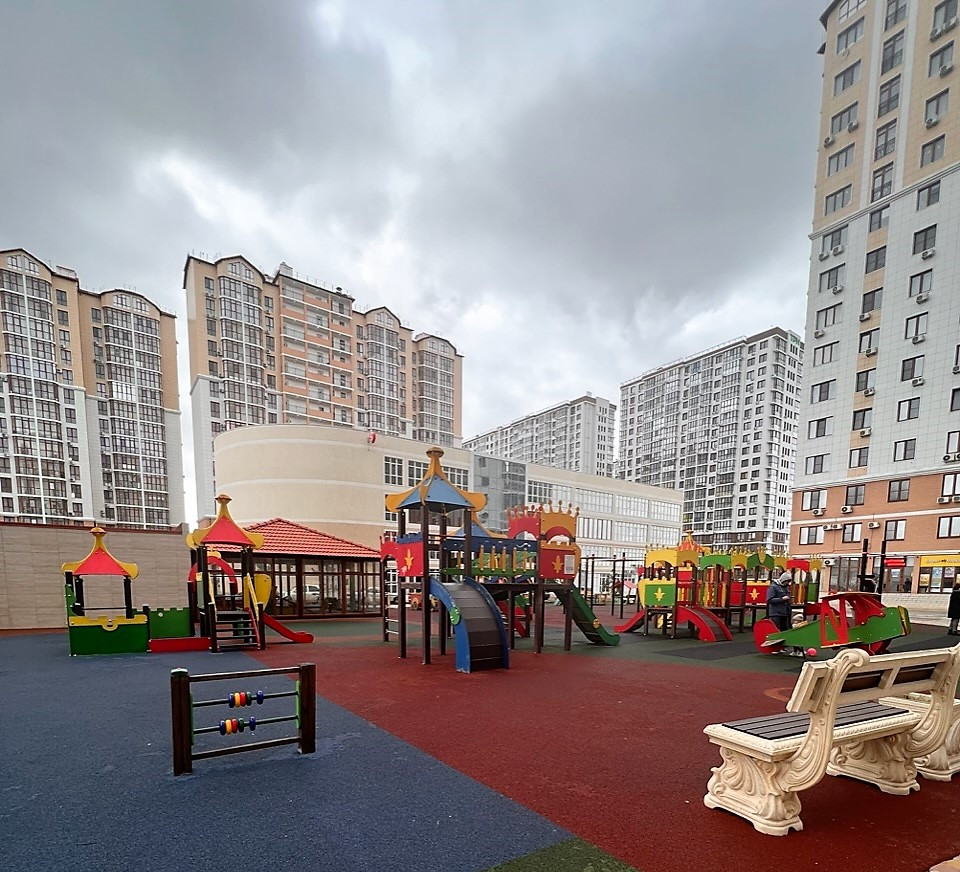 Просторный двор с детскими и спортивными площадками.