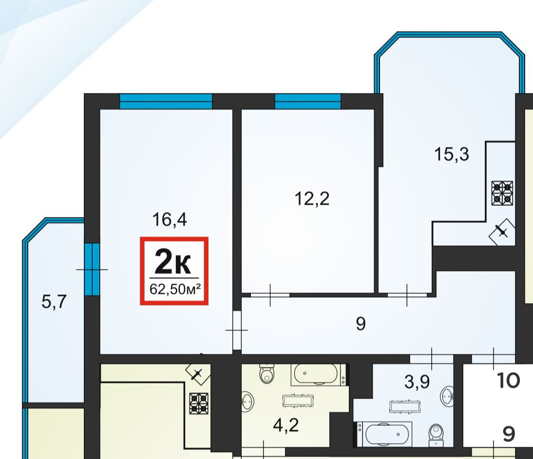 Отличная планировка: кухня-гостиная 15,3 кв.м, комнаты 16,4 и 12,2 кв.м, сан.узел 3,9 кв.м, коридор 9 кв.м.