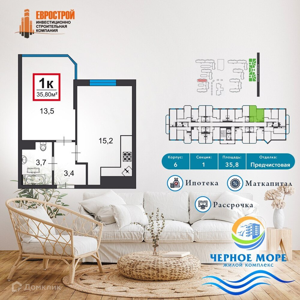 - уютная квартира общая площадь 35,80 кв.м., жилая комната 13,2 кв.м., а также просторная кухня-гостинная 15,2 кв.м