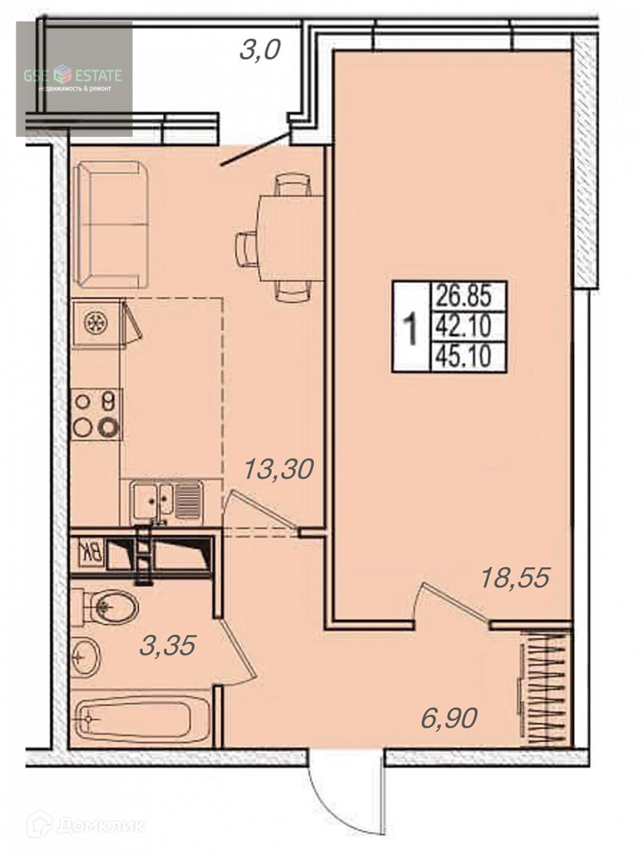 Общая площадь 45 м2