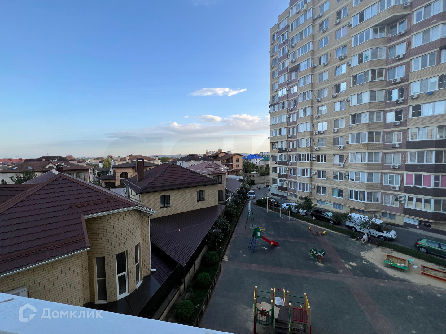 Детская площадка и парковочные места во дворе.