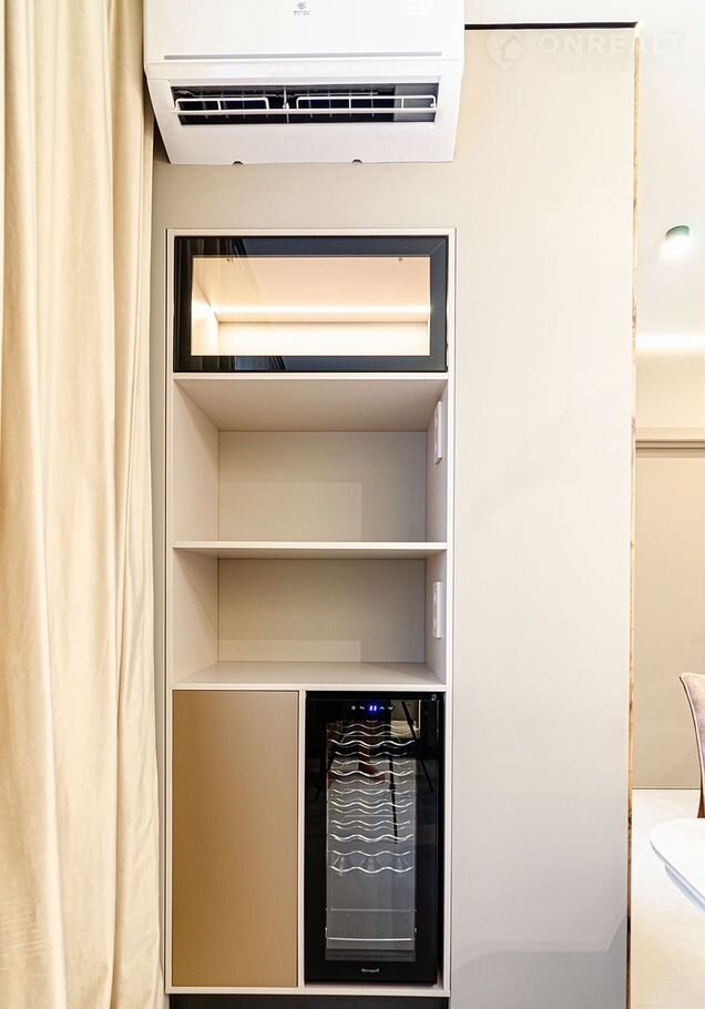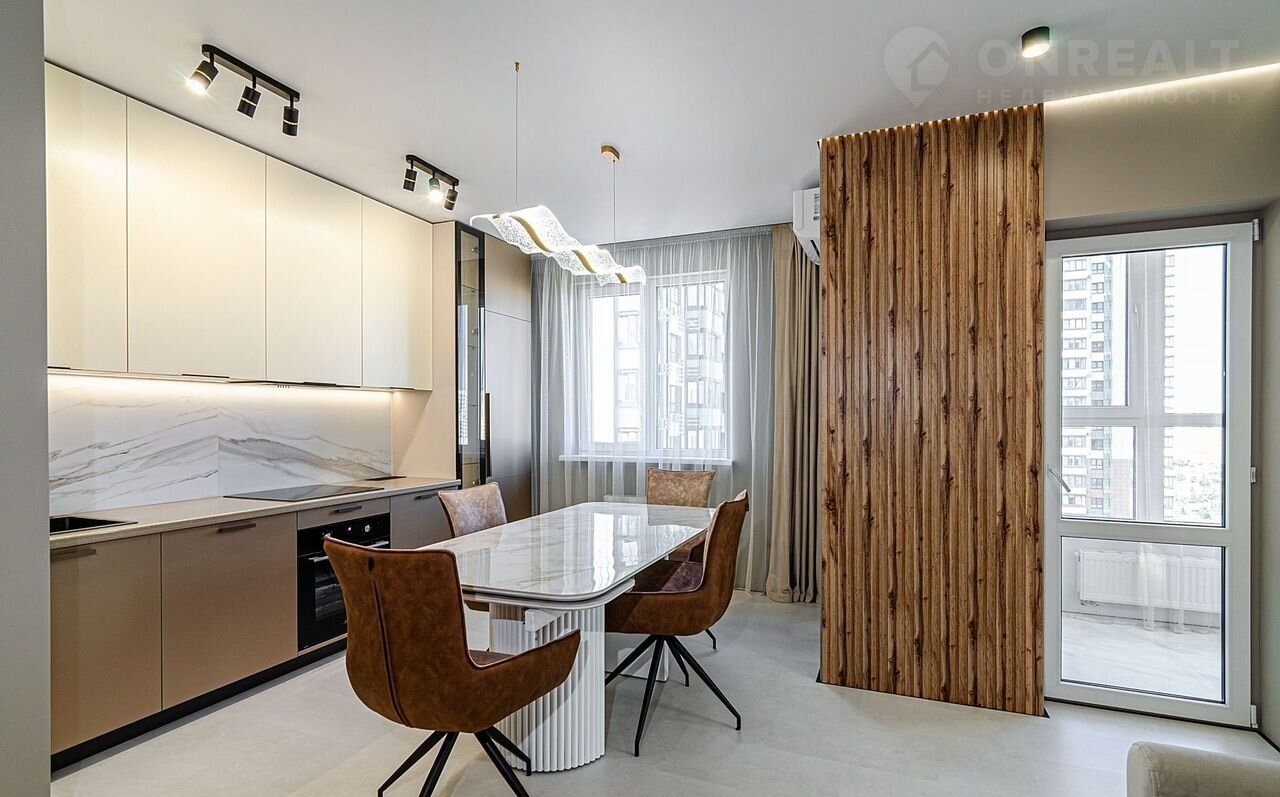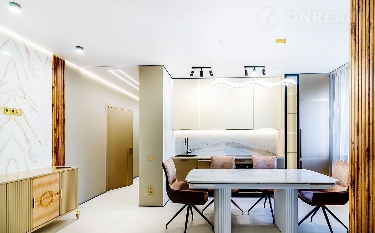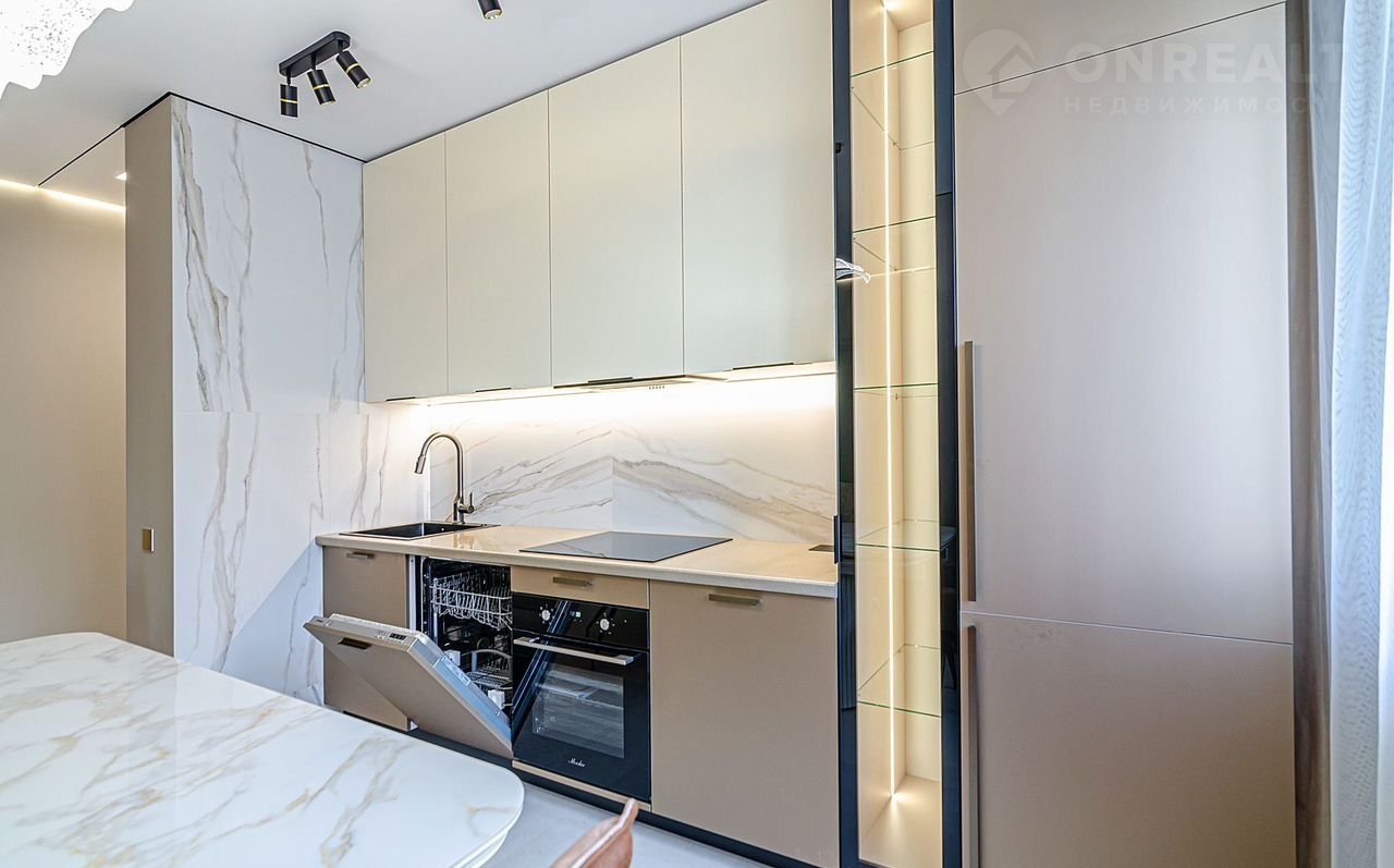 ✔ **Кухня-гостиная** с керамическим столом под стеклом, встроенным винных холодильником, посудомоечной машиной и стильными креслами с поворотным механизмом.