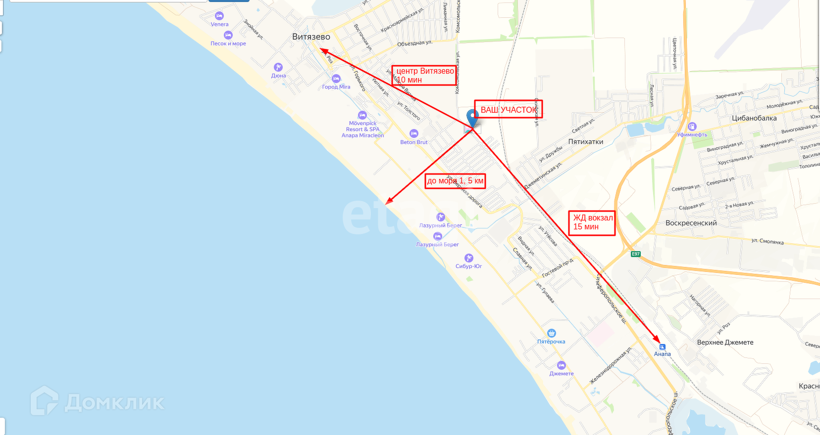 Здравствуйте! Продается отличный земельный участок в коттеджном поселке Эден Вилладж в непосредственной БЛИЗОСТИ от поселка ВИТЯЗЕВО. С участка открывается красивая панорама с видом на море и видом на горы . Непосредственно до моря полтора километра, недалеко (ориентир)отель Beton Brut. Участок разработан ,ровный правильной формы, заведено электричество (15кВт), есть возможность пробурить скважину. Есть дорога, отсыпана щебнем.Земля планировалась под КЕМПИНГ,замечательный загородный отдых.Отличная инвестиция, уже с идеей!