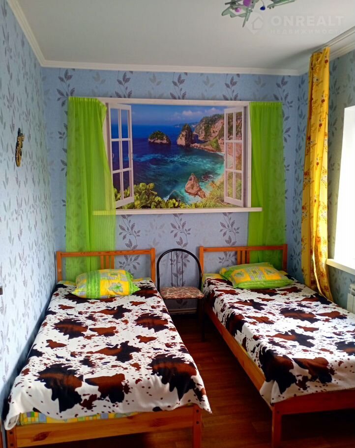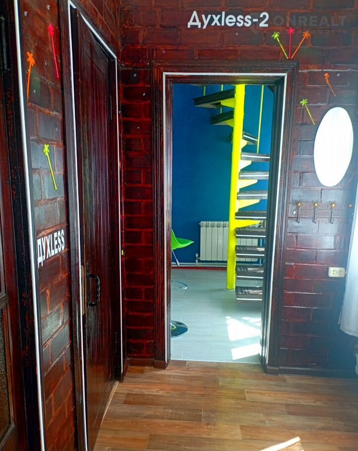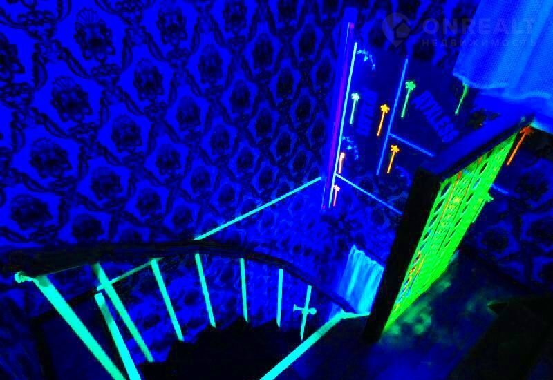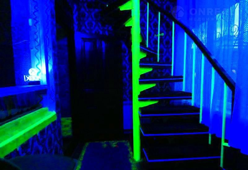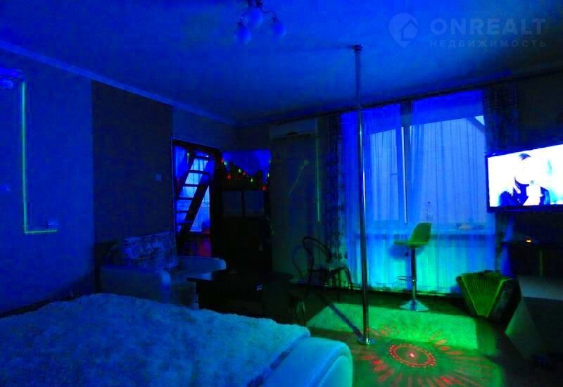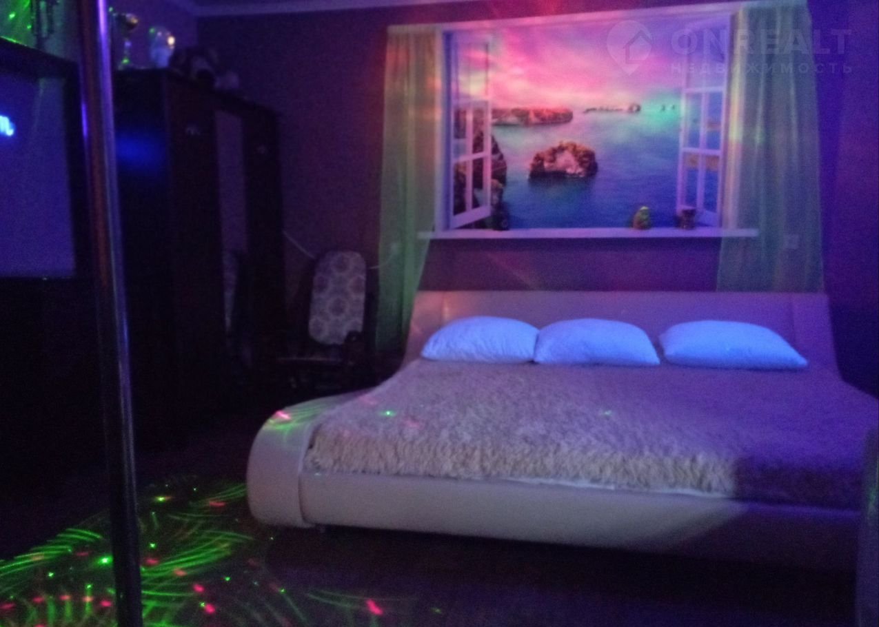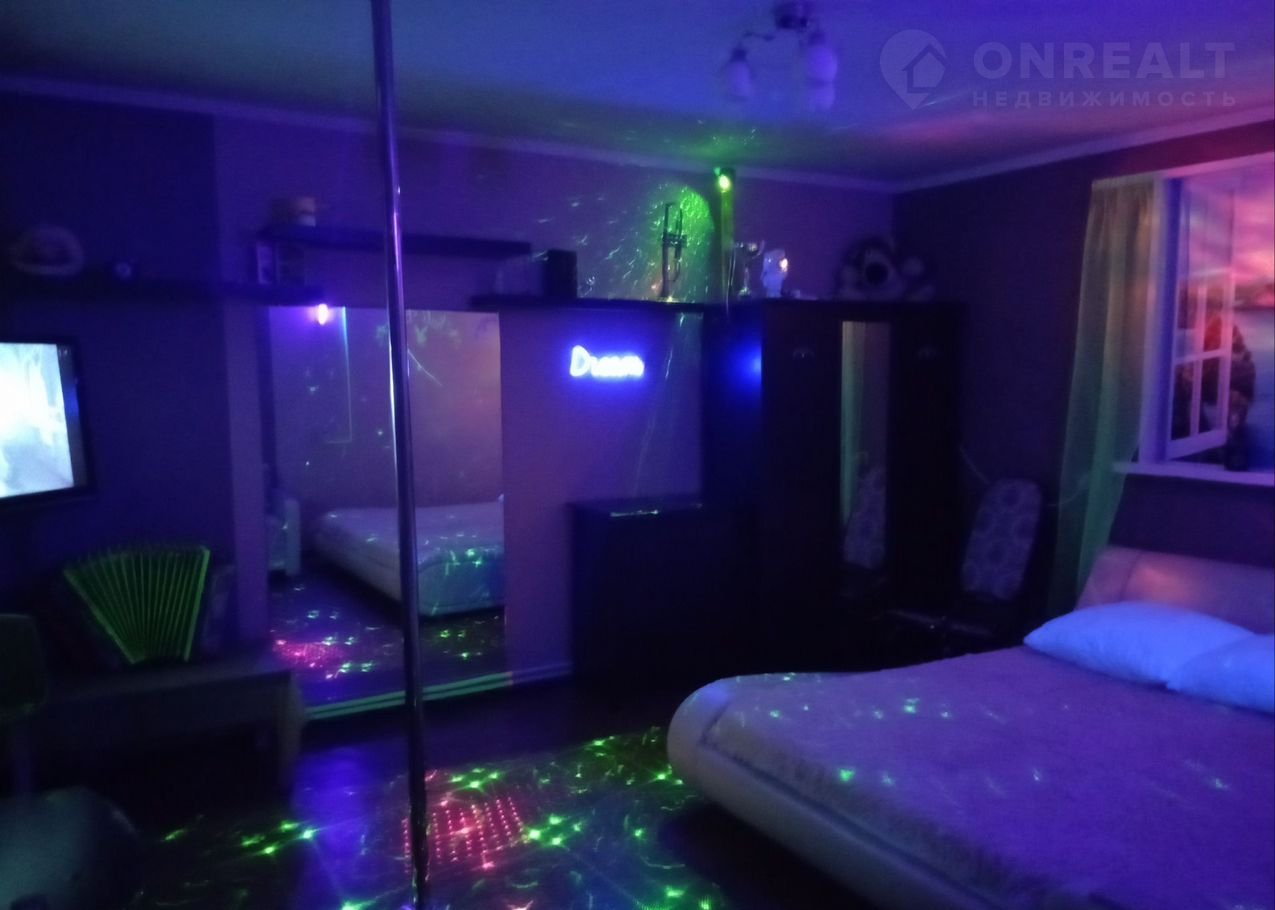 На 2 ом этаже в одной комнате 2 х спальная кровать king sizе фирмы "Аskоnа", раскладное кресло, пилон, напротив большое зеркало, световые музыкальные приборы. В другой комнате 2 односпальные кровати.