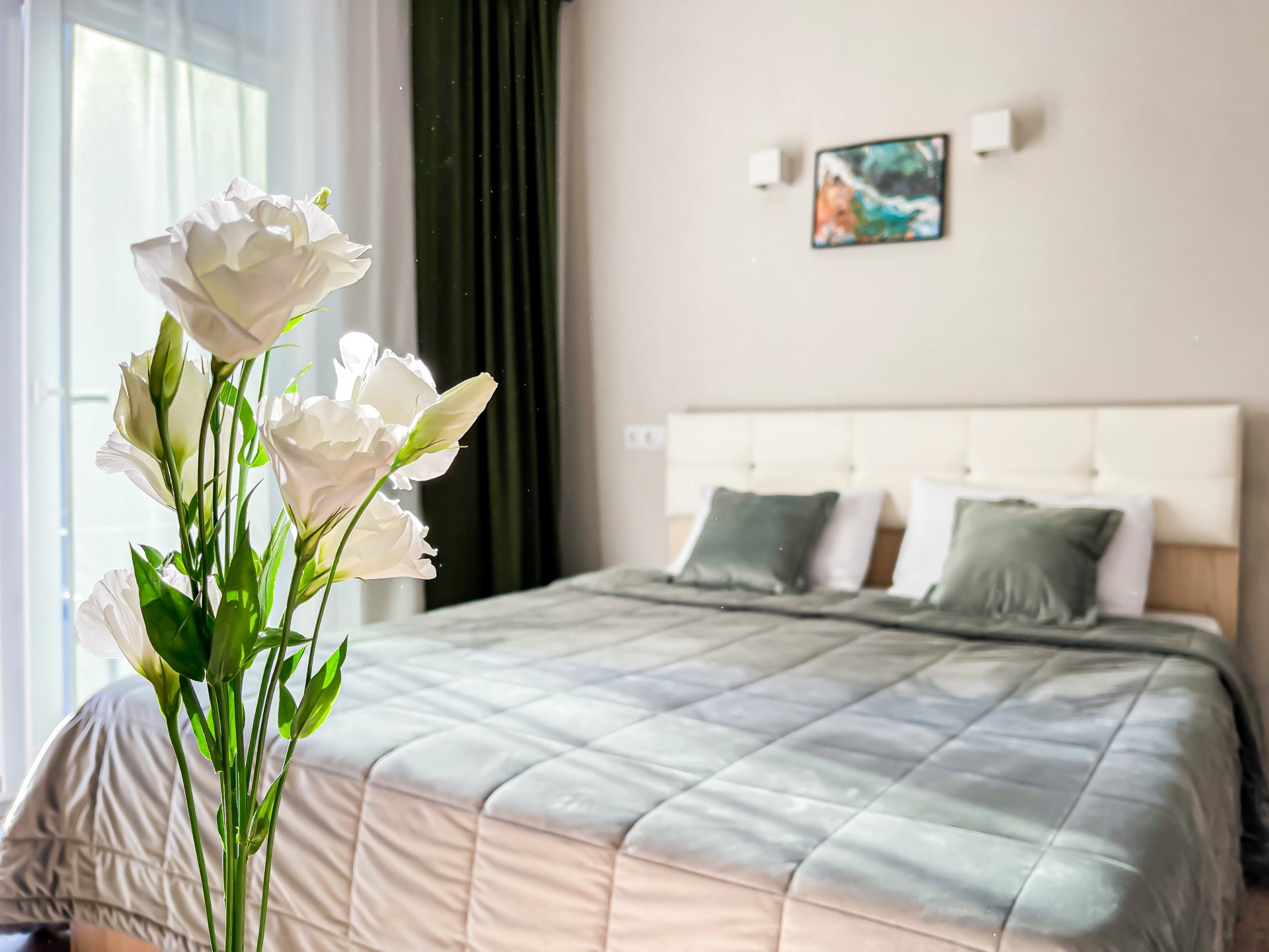 Большая и комфортная кровать, качественное белоснежное пастельное белье, кондиционер.