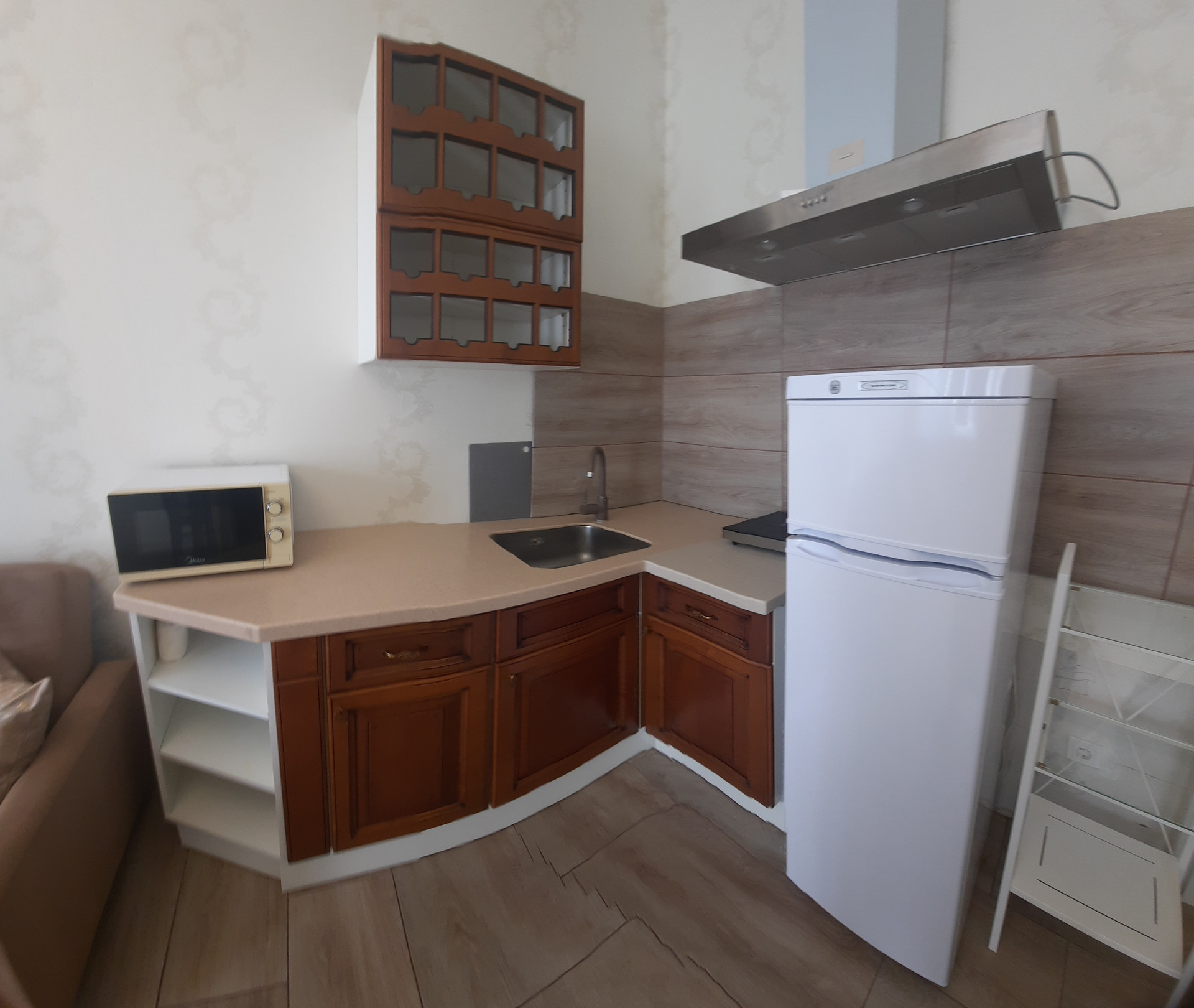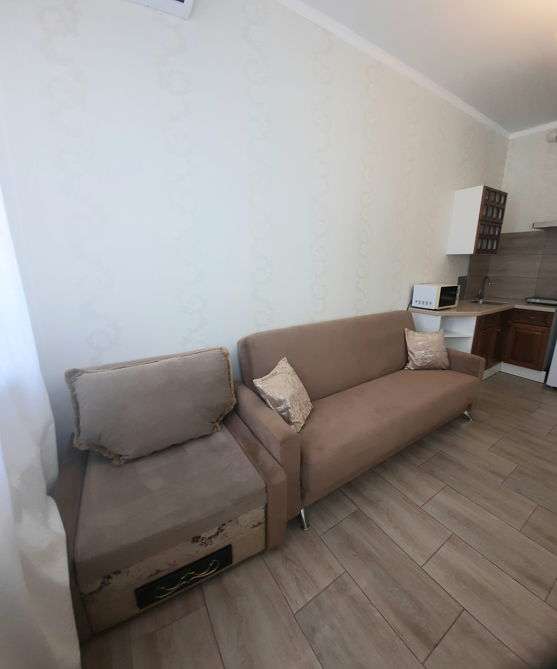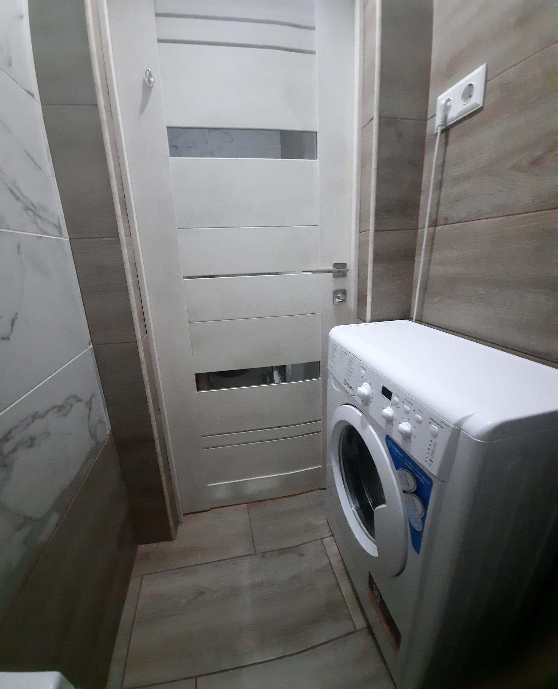 В квартире новая мебель, телевизор, стиральная машина, кухня.