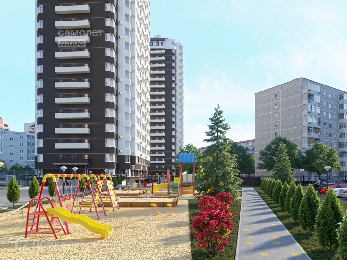 - Рядом с домом 2 детских сада, школа, оборудованная спортивная и детская площадка, поликлиника, торговый центр, ярмарка, остановки, парикмахерские