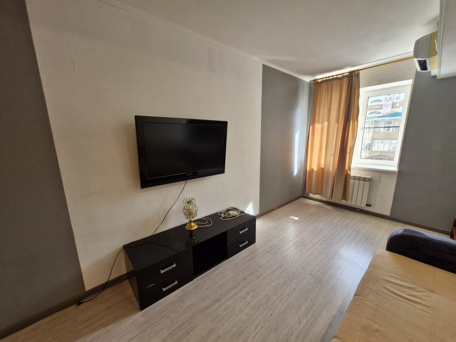 Квартира-"распашонка", светлая, уютная, чистая, с большой кухней и застекленной лоджией. Для проживания есть всё. Смотрите фото. Отопление и горячая вода от газового котла, коммунальные платежи небольшие. Две сплит-системы (в спальне и кухне).