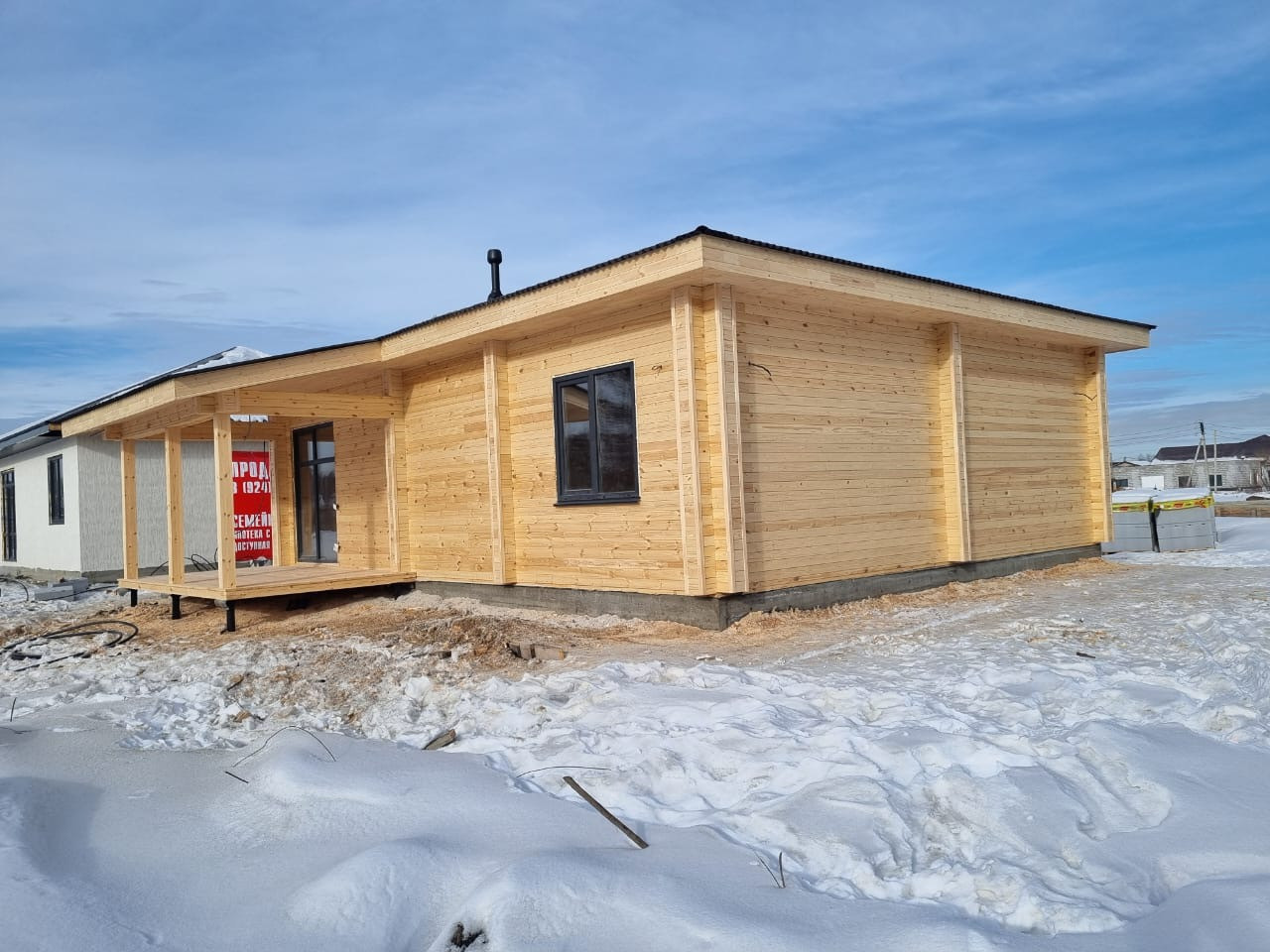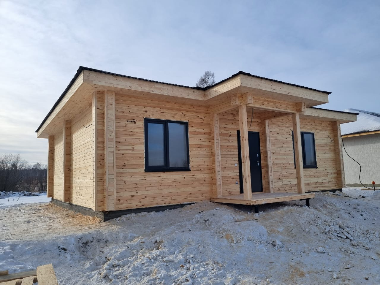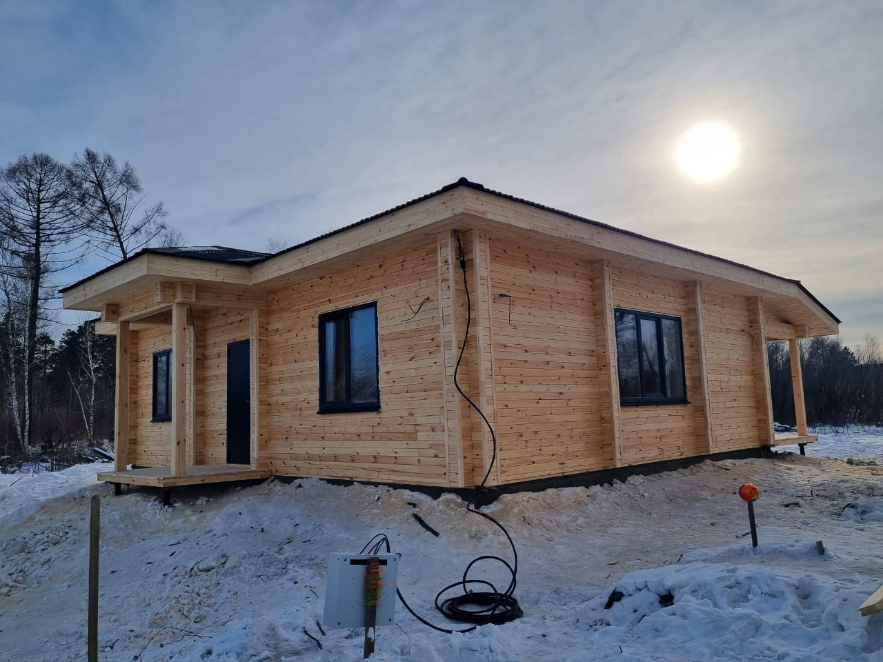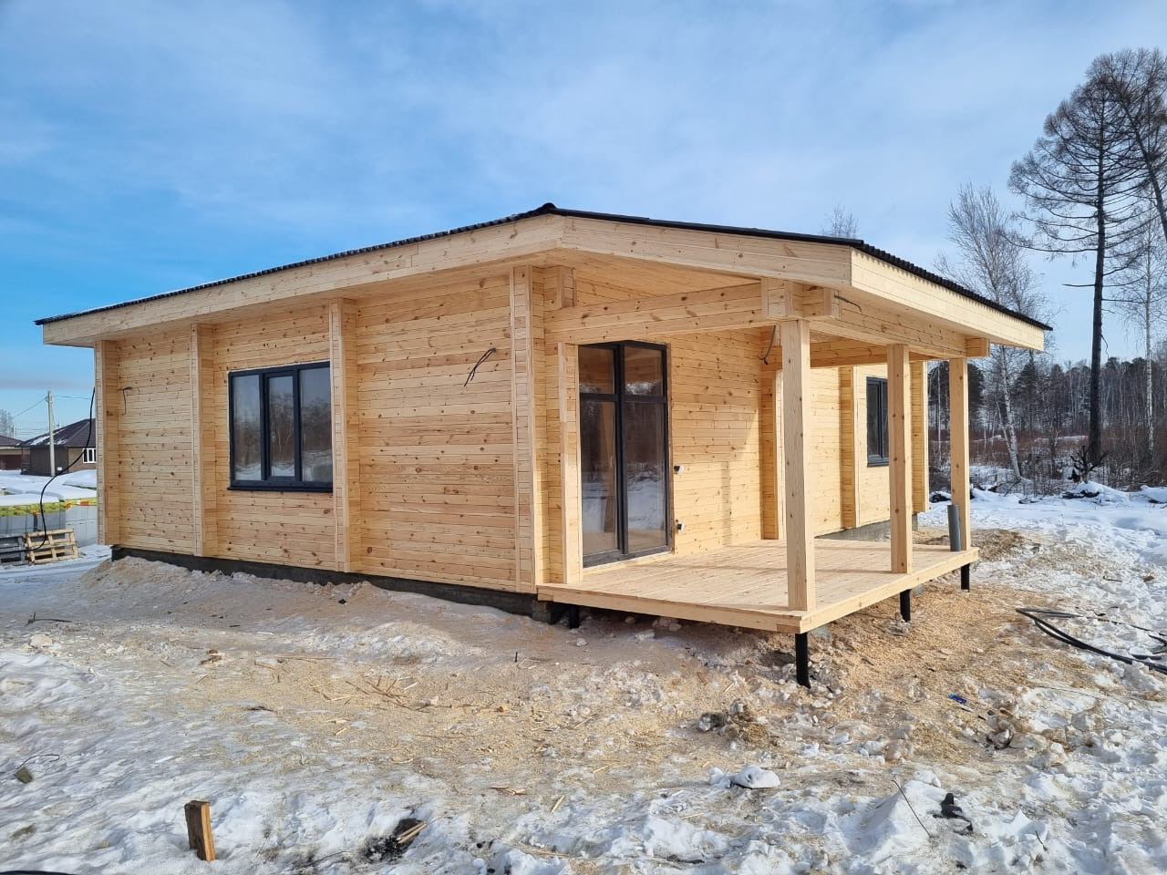 Одноэтажный теплый дом из двойного бруса на монолитной плите. Продуманная планировка, комфортная для проживания, большие панорамные окна с выходом на террасу.