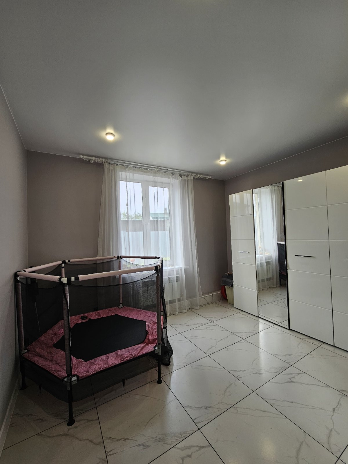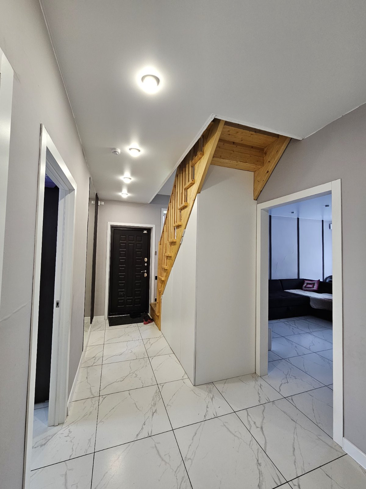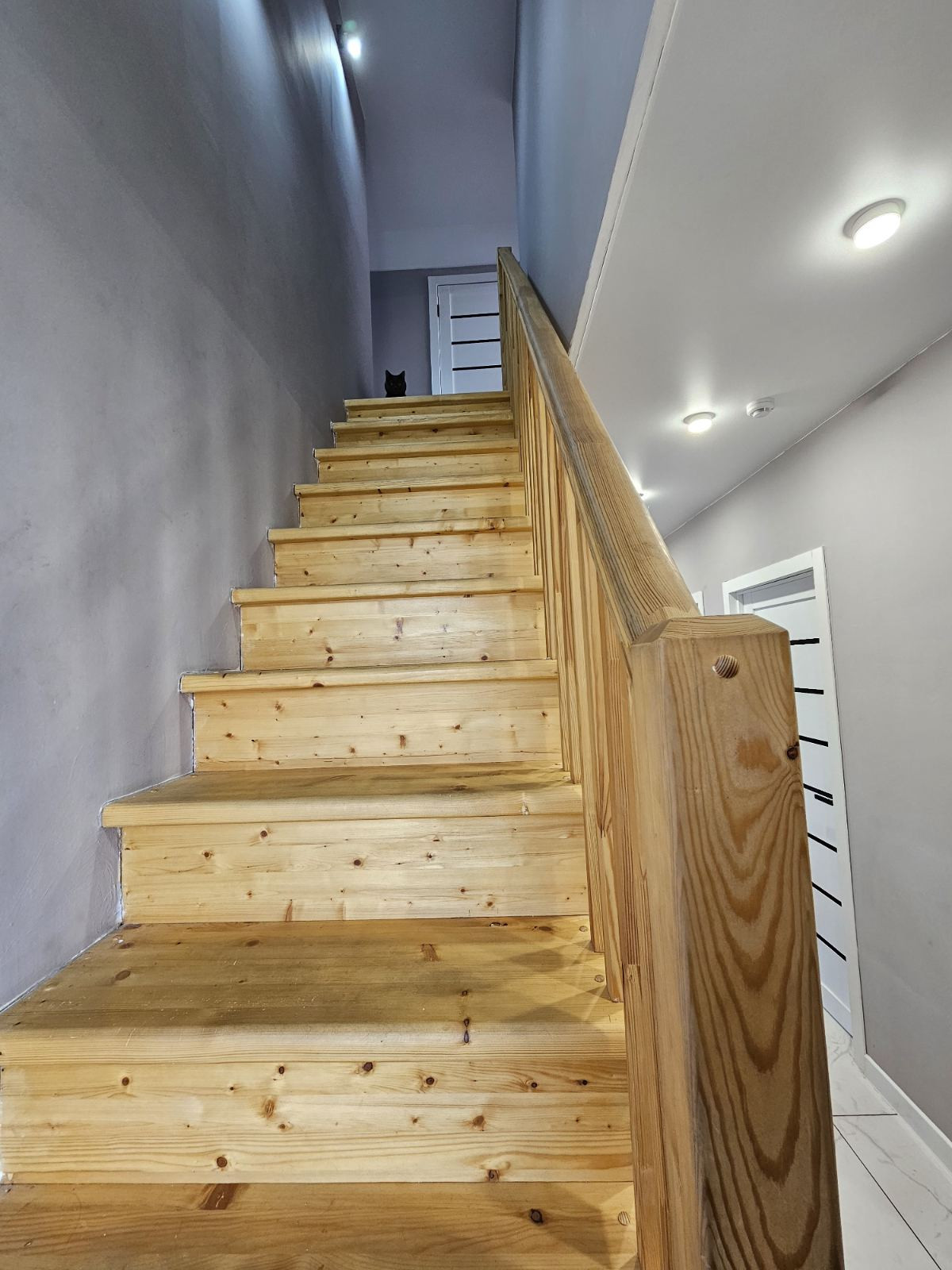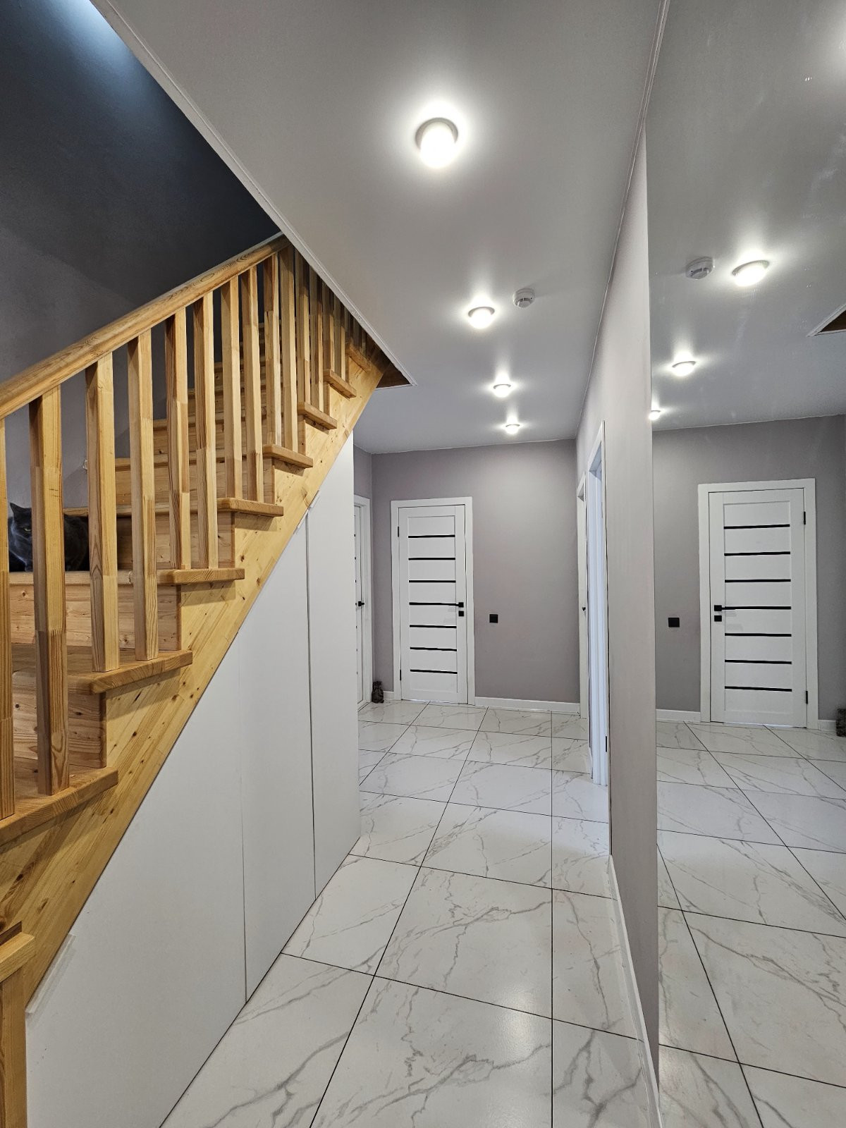 На первом этаже на полу уложен керамогранит, на втором этаже-ламинат высокого класса защиты.