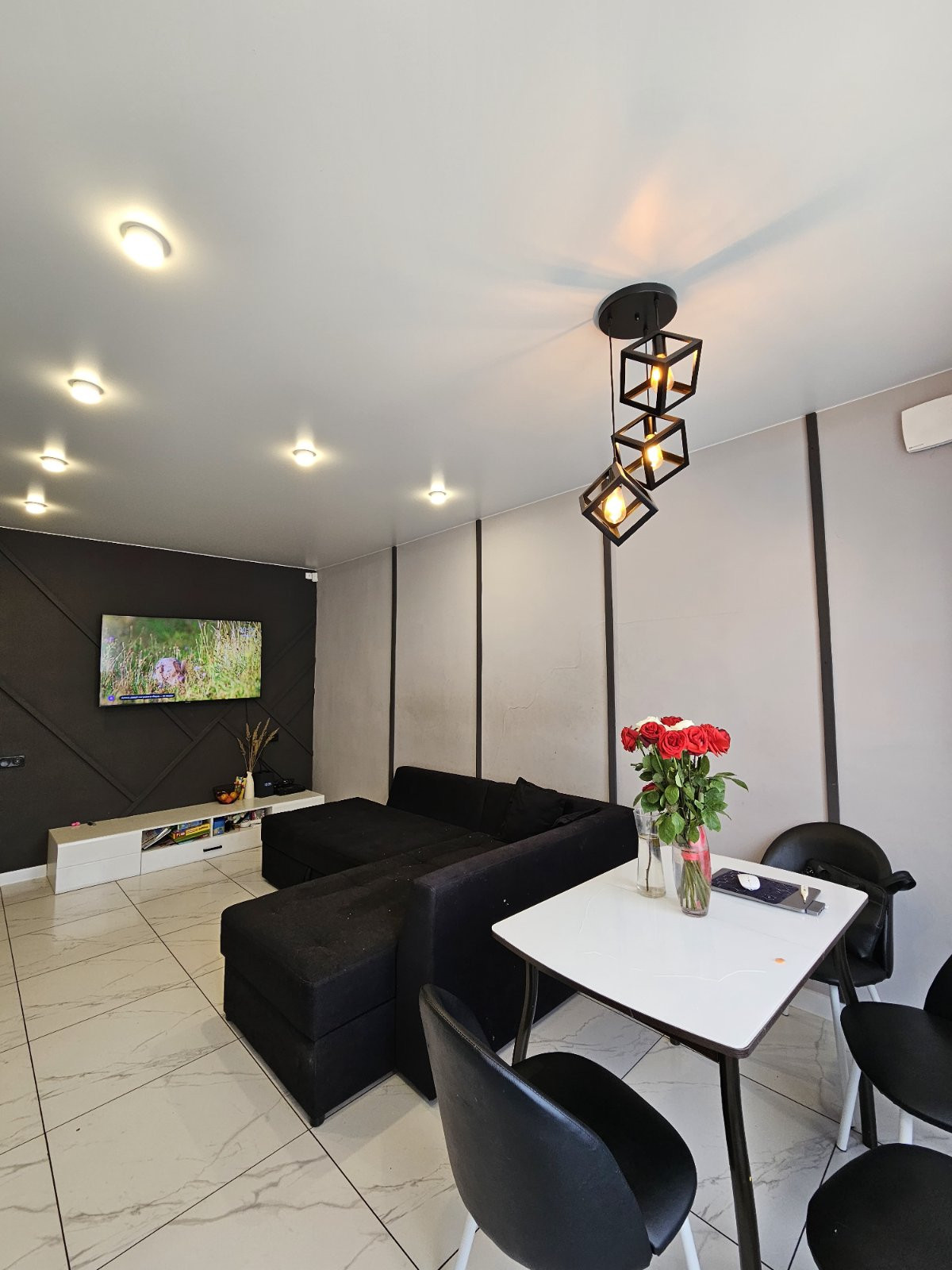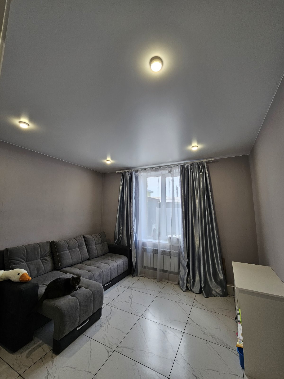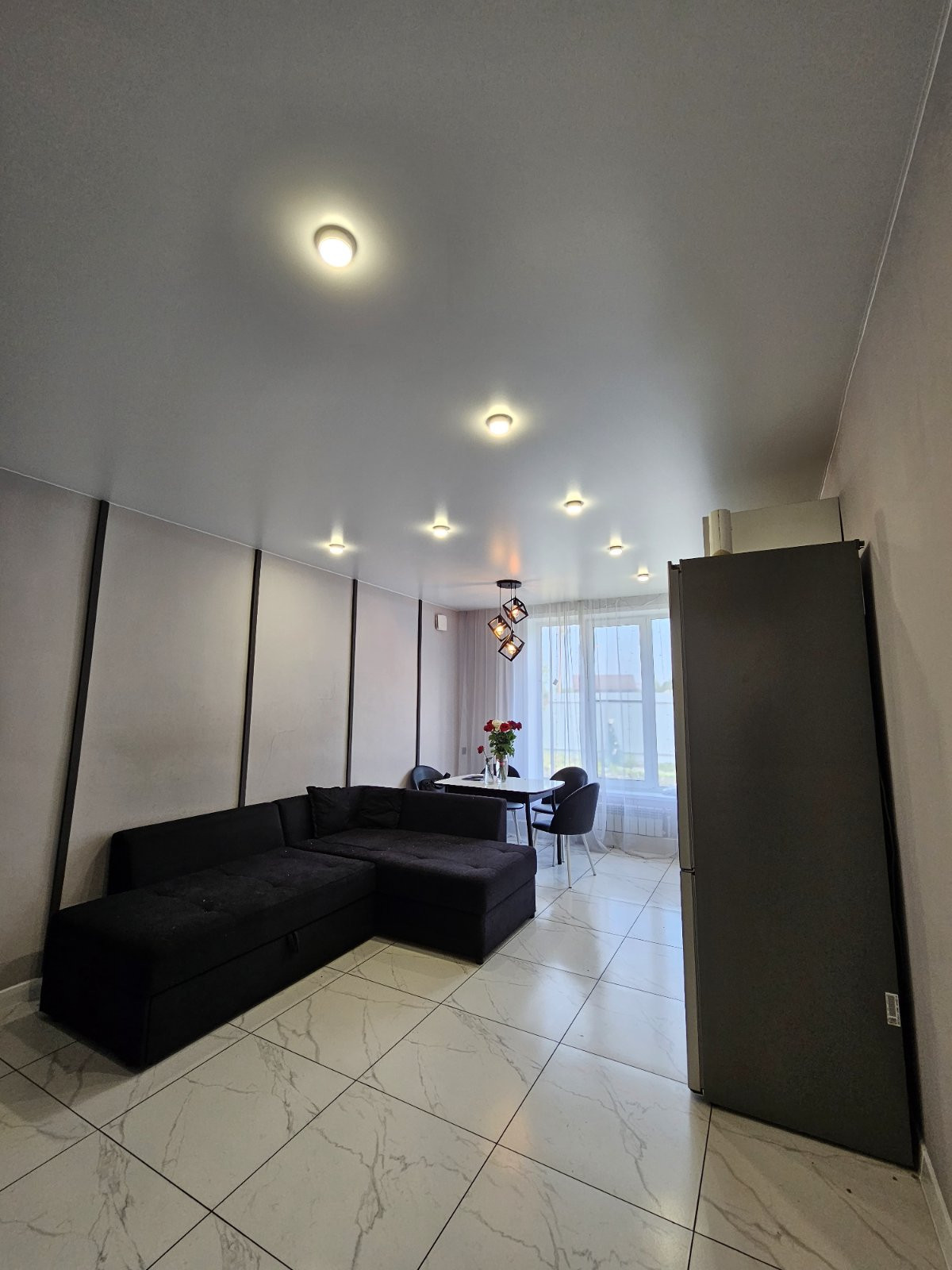Сатиновые натяжные потолки с грамотно распределенным освещением.