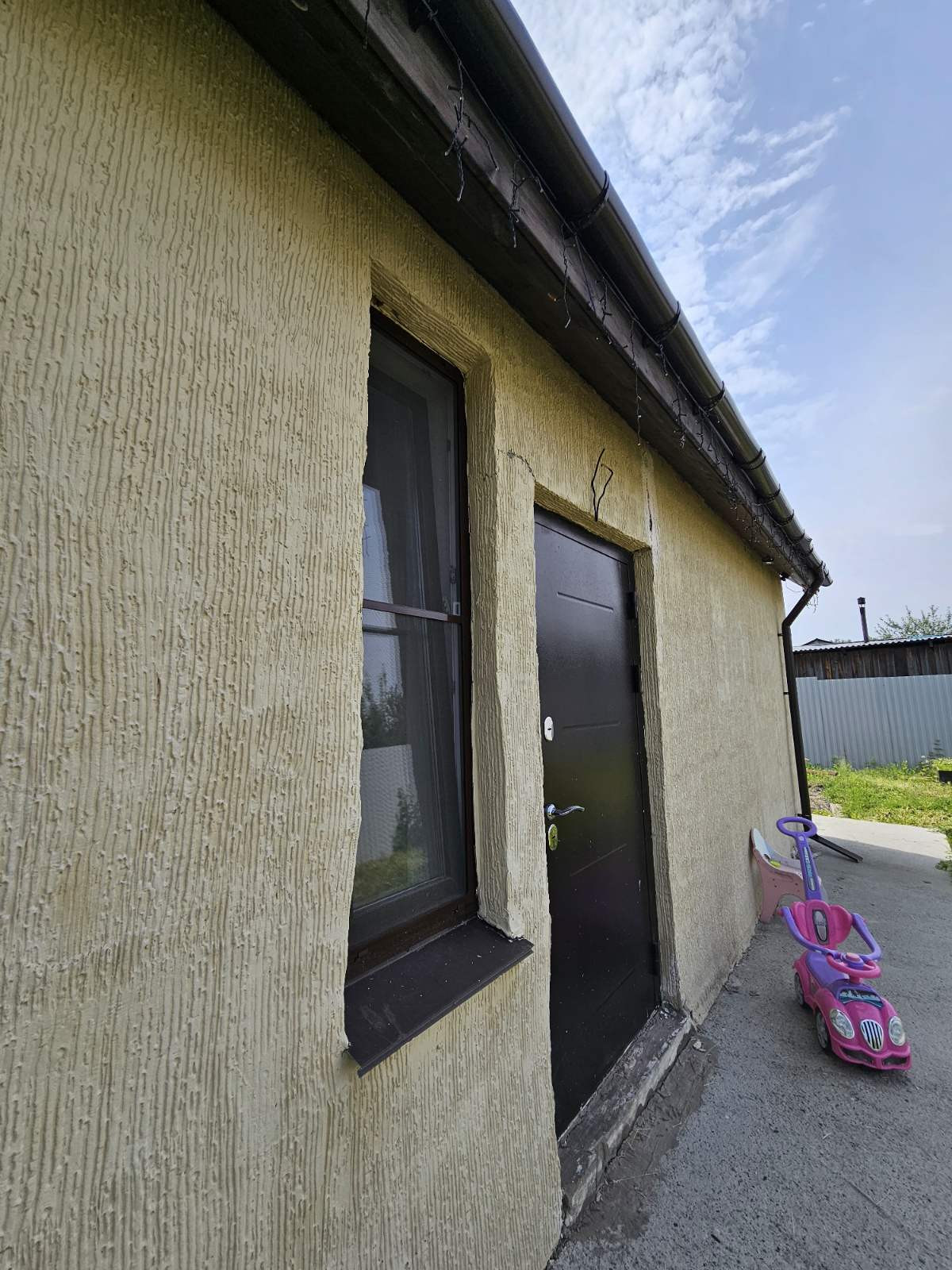Снаружи отделка стен штукатурка "короед", крыша металлочерепица.