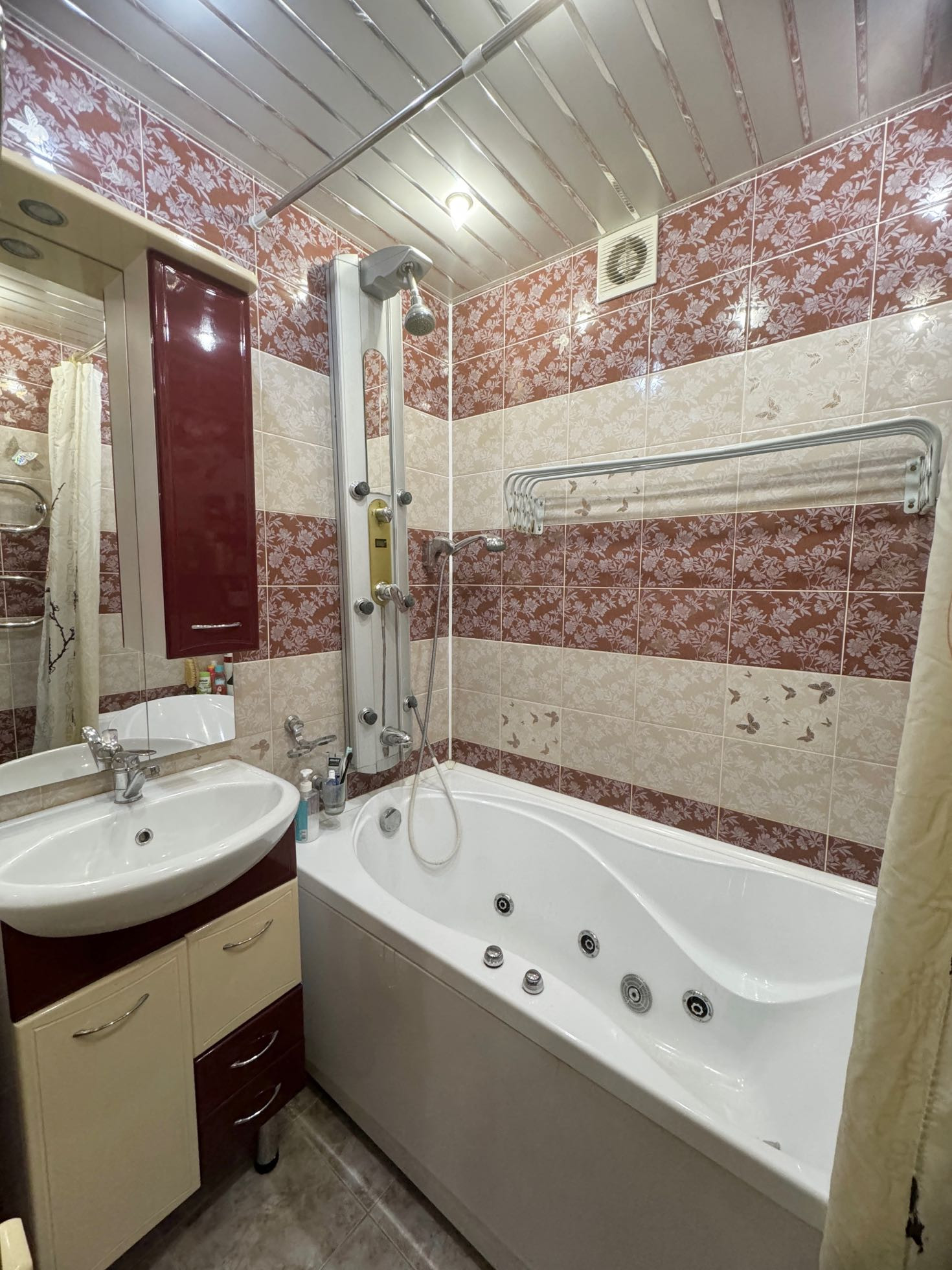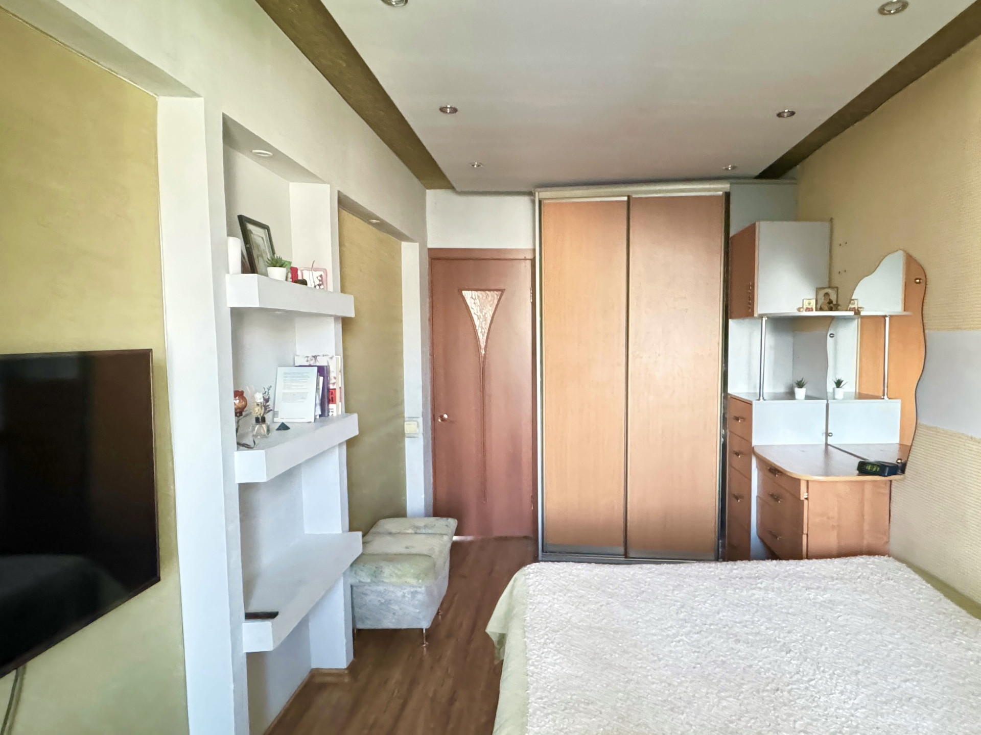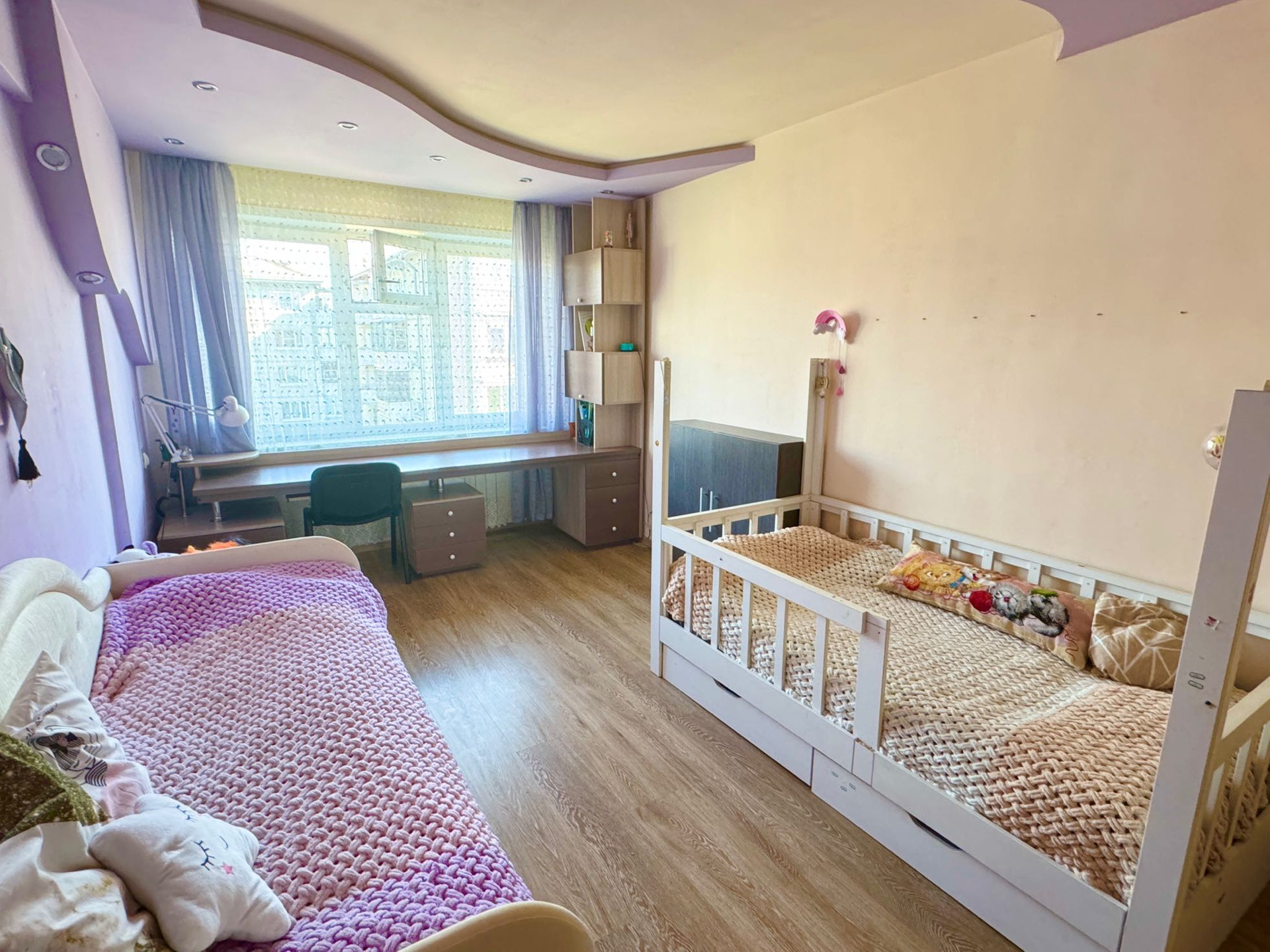 Лоджия утеплена и объединена со спальней, в лоджии сделан кабинет. В санузле удобный хозяйственный шкаф, гидромассажная ванна.  На полу ламинат. Потолки натяжные, в спальнях многоуровневые . Во всех комнатах много вариантов подсветки.
