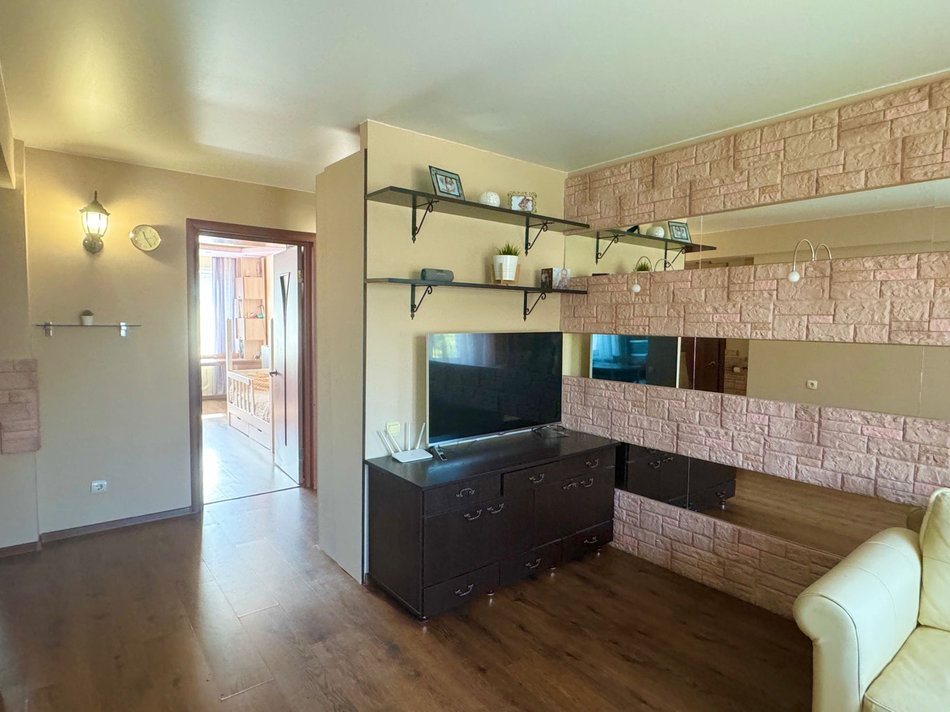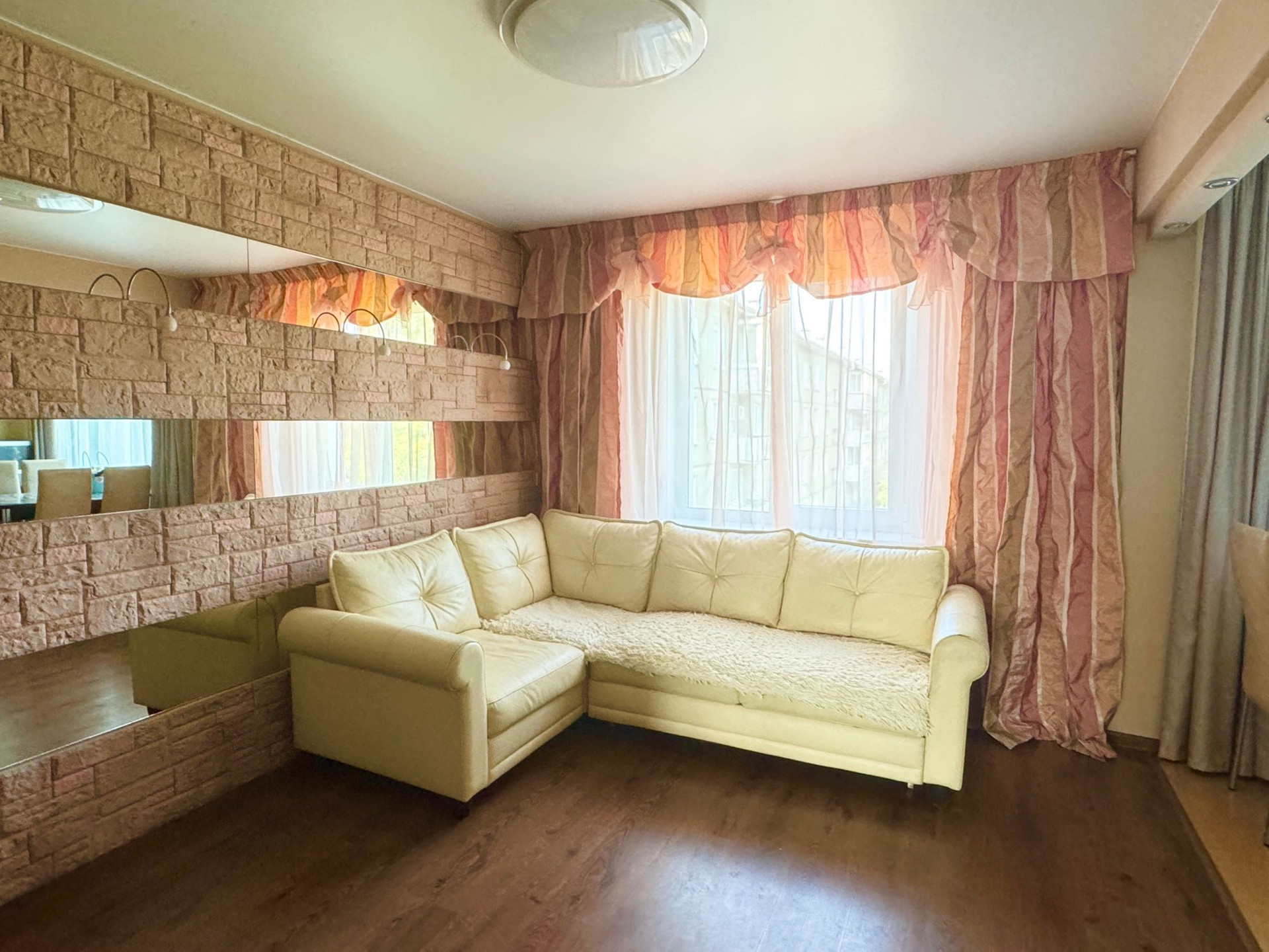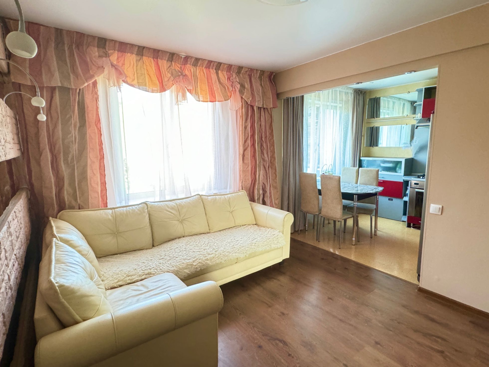 Квартира в отличном состоянии, вложений не требует. Теплая, солнечная. Кухня объединена с комнатой, расширен санузел, перепланировка узаконена. В квартире  остается почти вся мебель (кухонный гарнитур с варочный поверхностью и духовкой фирма gorenje, диван, шкафы в спальнях и коридоре, стол в детской и двуспальная кровать).