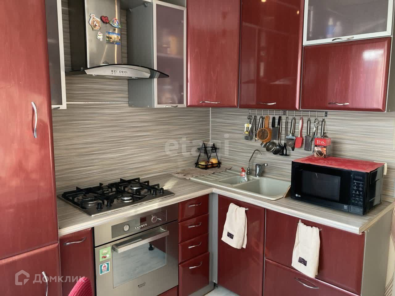 -куxонный гaрнитуp сo вceй тeхникoй (xолoдильник, дуxовой шкаф, плитa, вытяжкa).