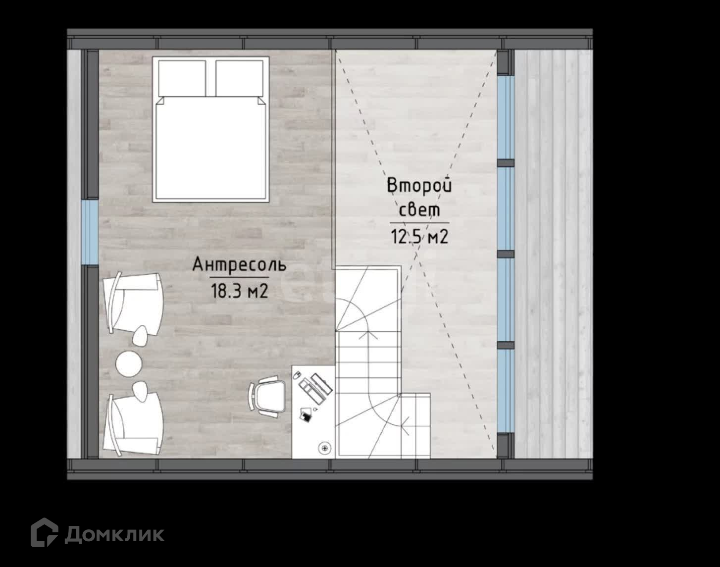 На первом этаже расположена отдельная спальня, а также современный санузел с душевой кабиной. Просторная кухня-гостиная с высокими потолками и панорамными окнами наполняет пространство светом и создает атмосферу уюта. Лофт-антресоль предлагает дополнительные спальные места и удобную зону для хранения вещей.