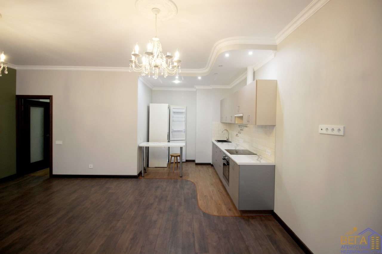 Кухня оборудована всей необходимой встроенной техникой, которая останется новым владельцам, в прихожей предусмотрен встроенный шкаф.