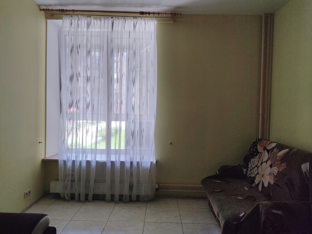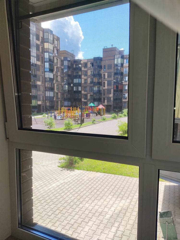 Высокий первый этаж, окна выходят во двор, просторная входная группа, двор без автомобилей.