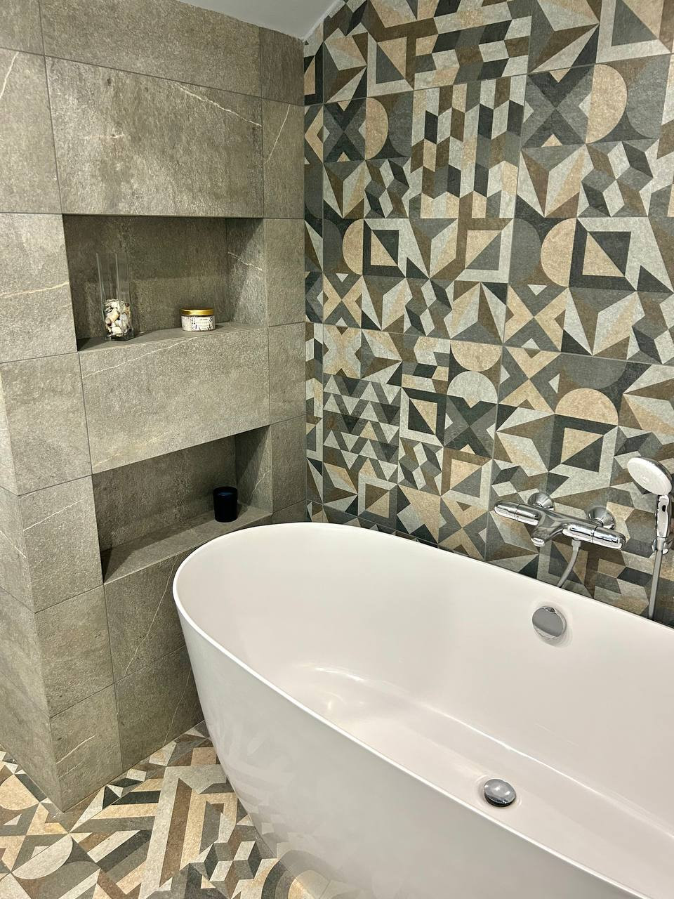 Ванная комната из керамогранита с большой душевой зоной метр на метр, сушильной и стиральной машинками фирмы Bosch
