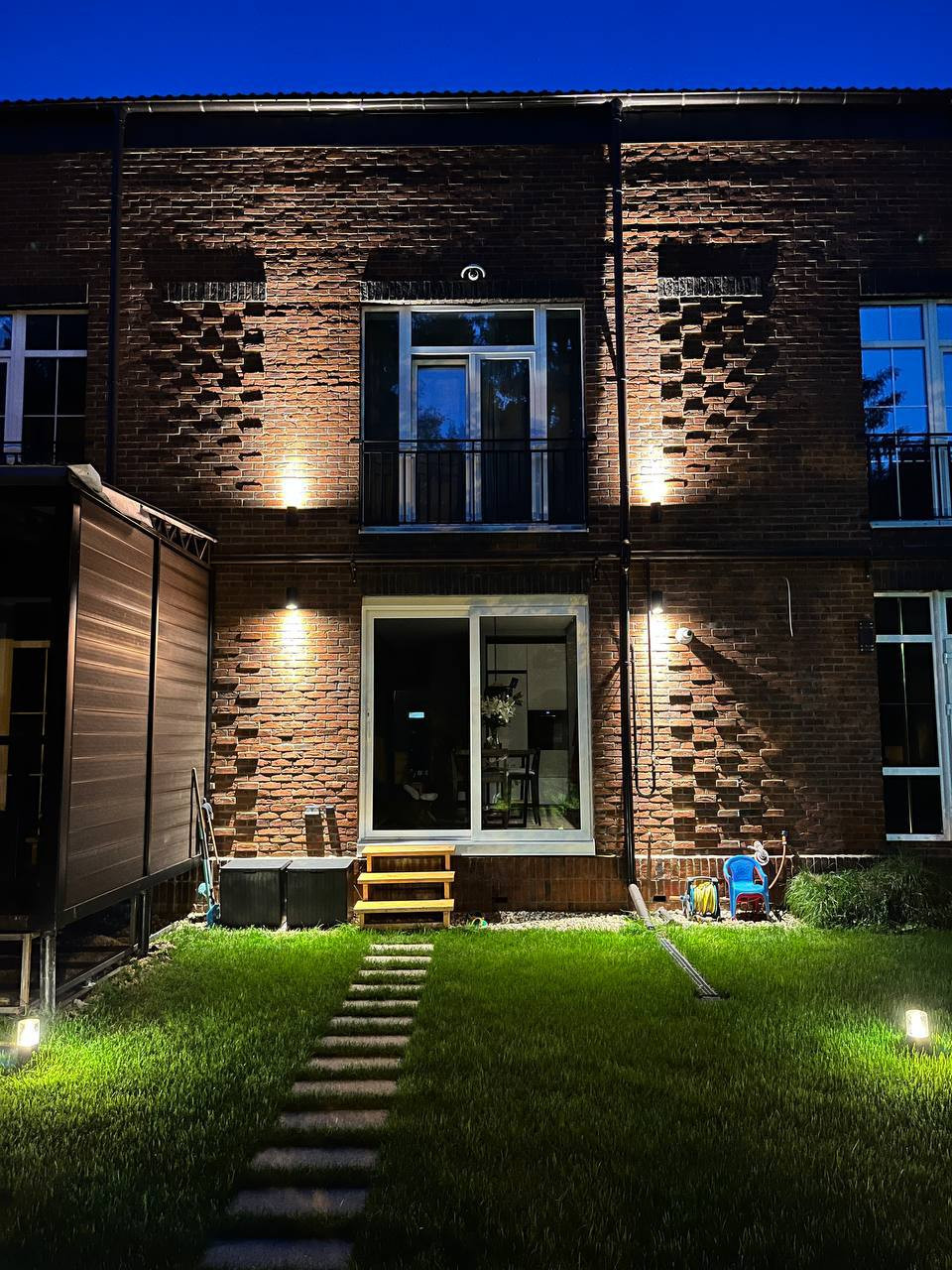 Участок выровнен, сделаны дренаж и ливневка, уложен рулонный газон, высажены 2х метровые туи, сделана подсветка участка, зоны отдыха и зоны барбекю, подсветка фасада с обеих сторон. Подсветка работает от астрономического реле. На участке уложена уличная плита Steingot. Установлена система видеонаблюдения с обеих сторон дома через облачное хранение.