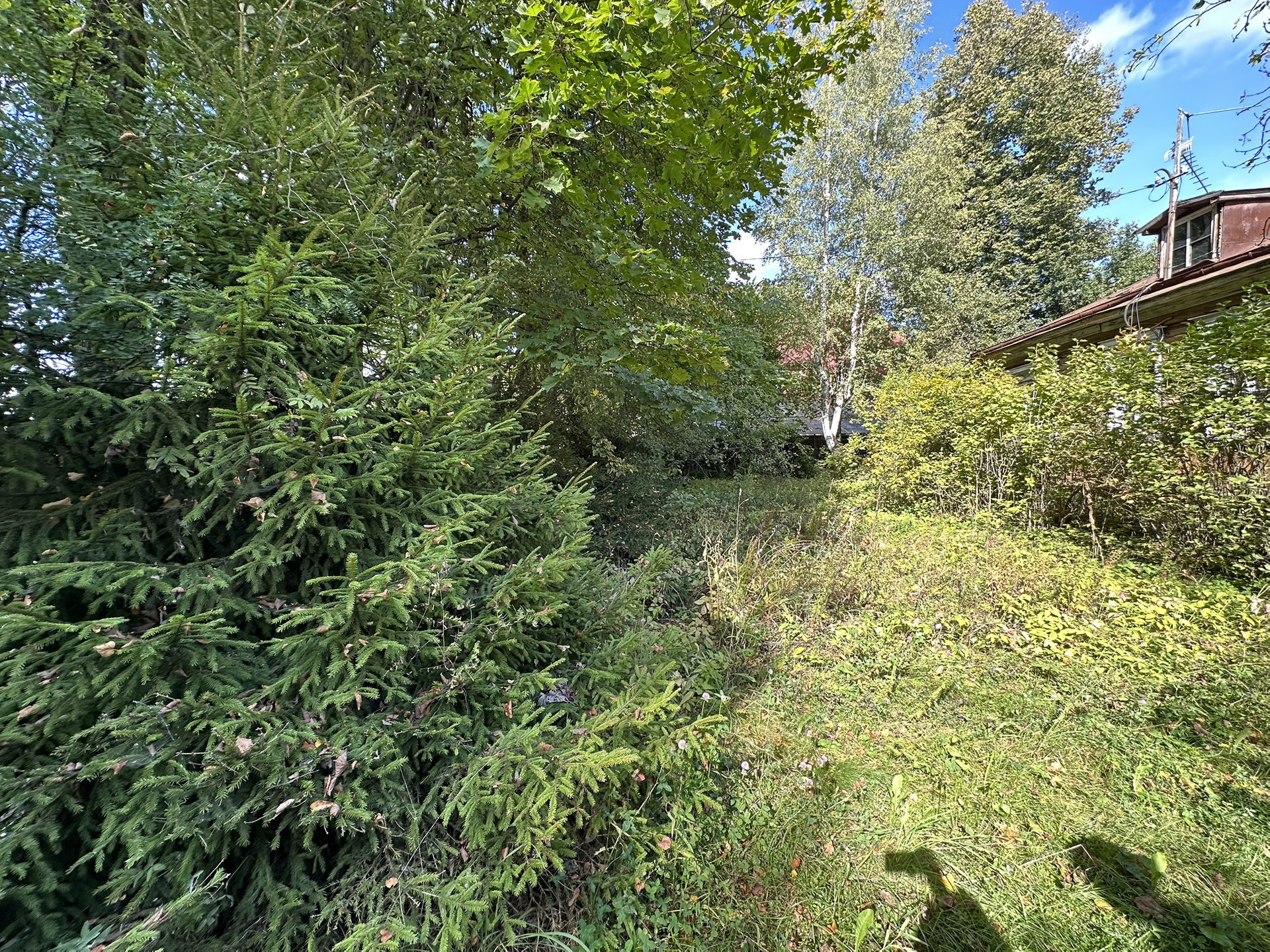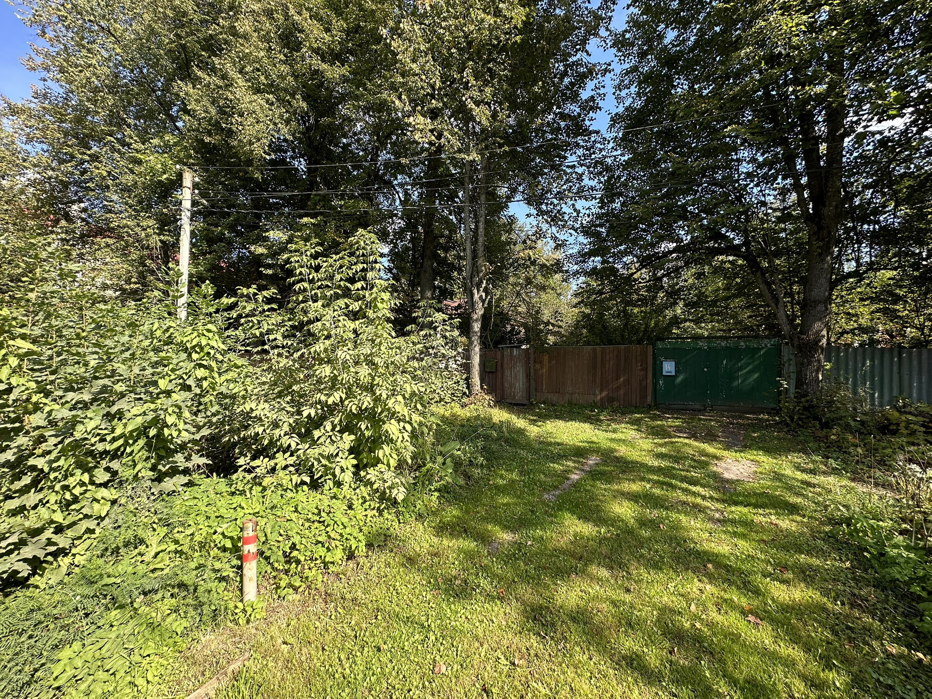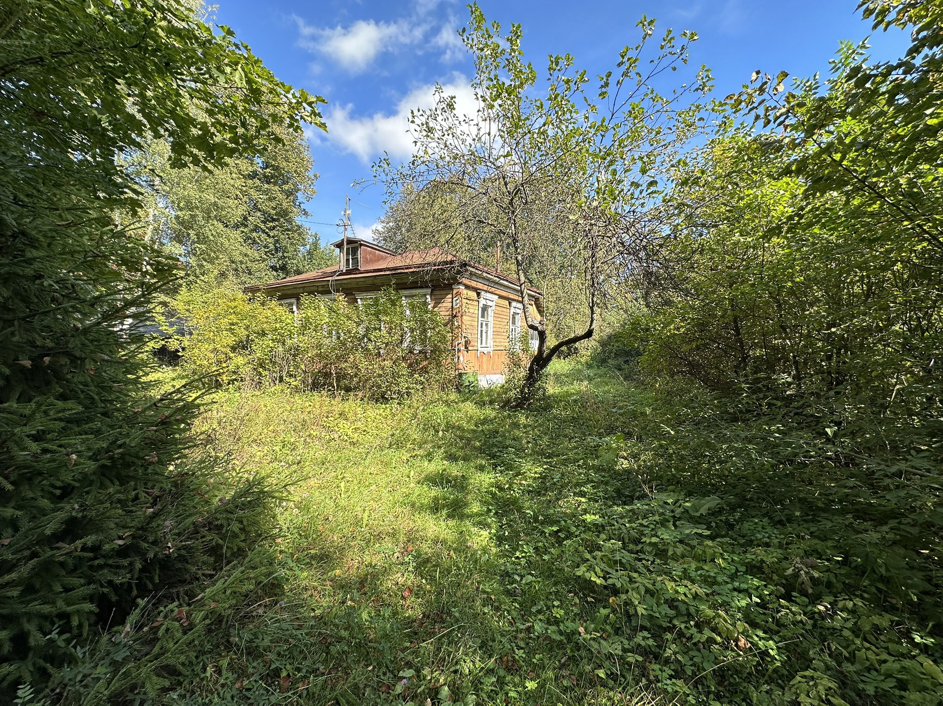 На территории растут плодовые и декоративные деревья.