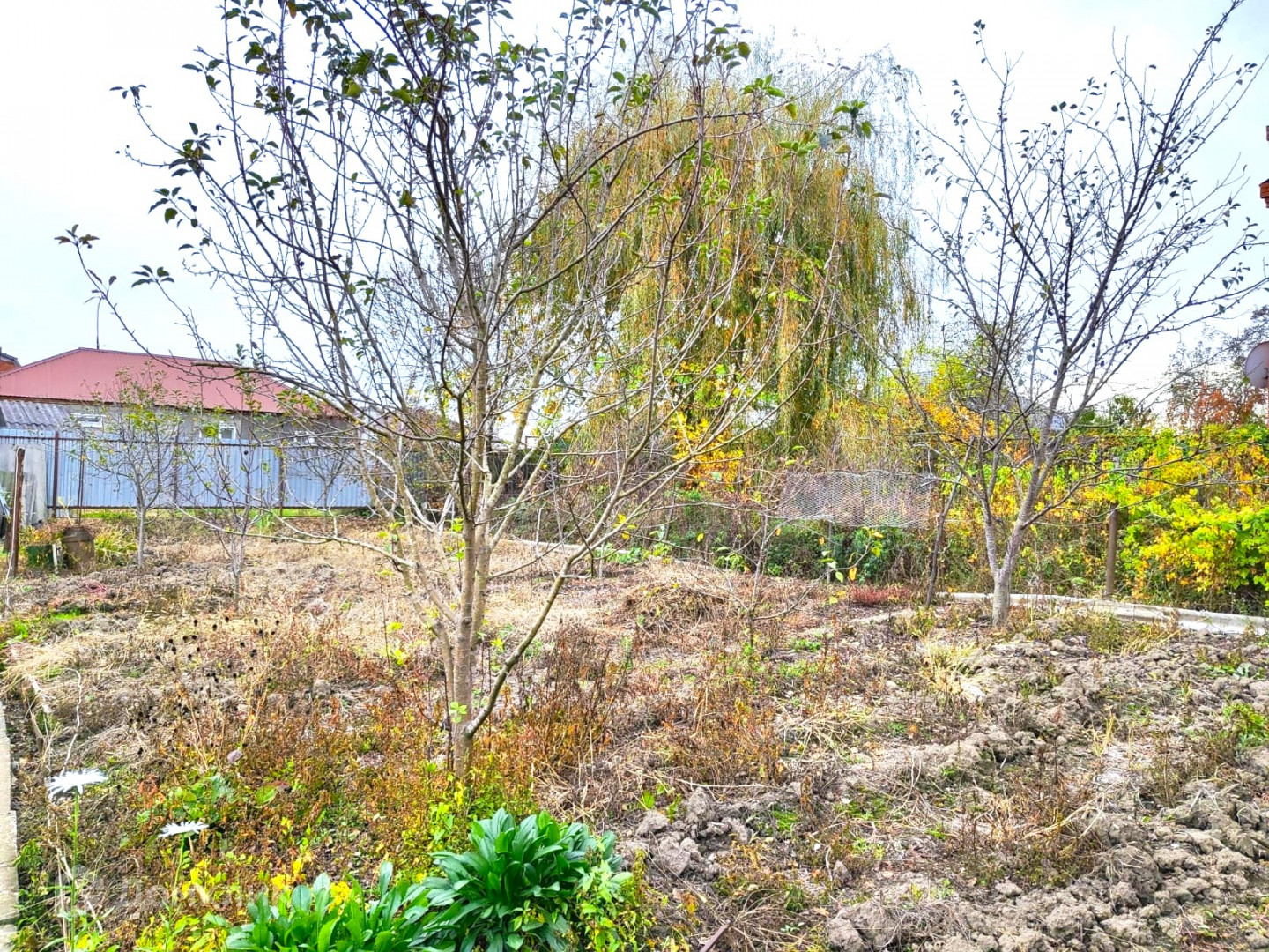 На участке парковочное место для автомобиля, высажены плодовые деревья,