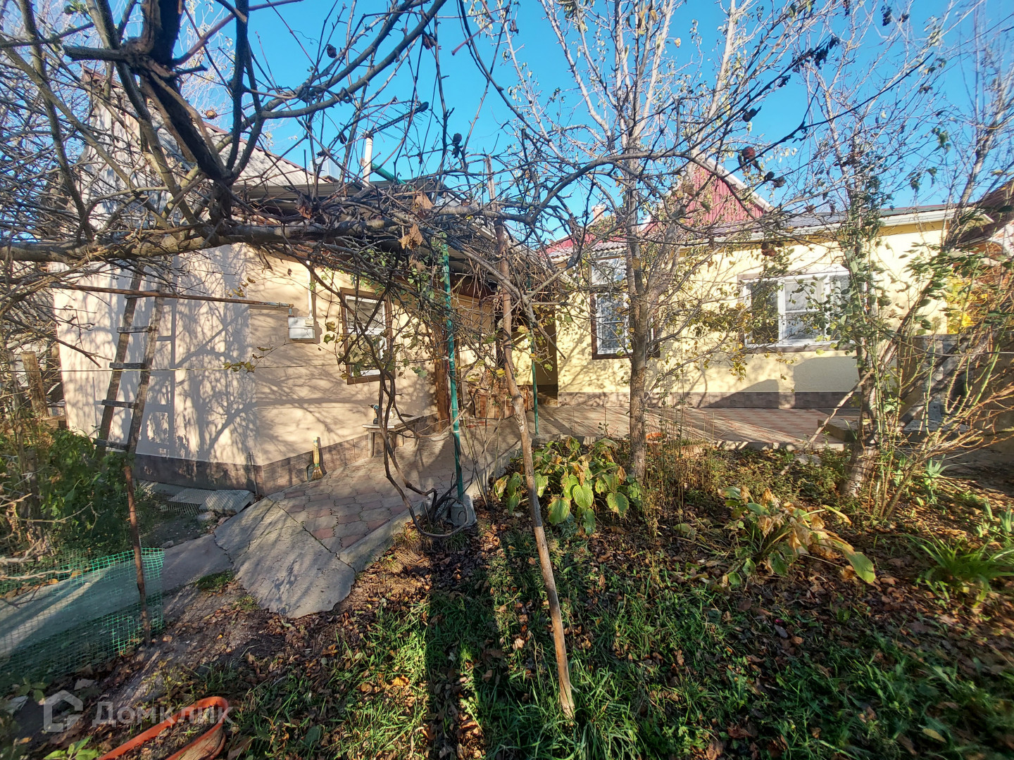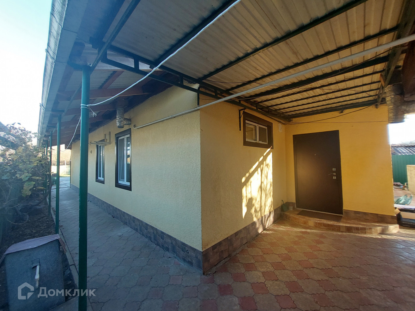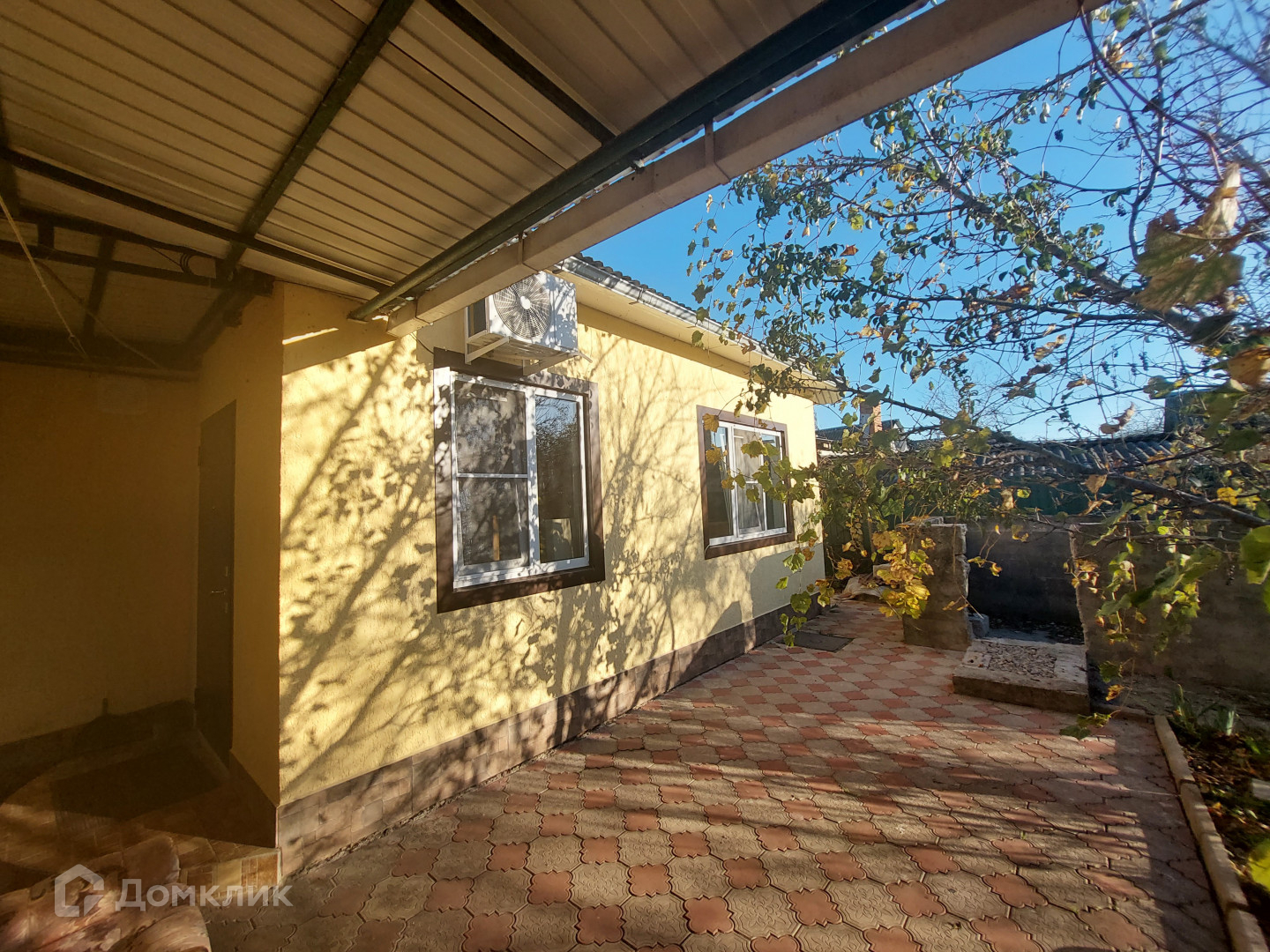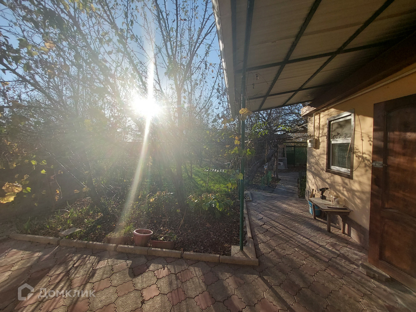 Двор вымощен тротуарной плиткой, несколько навесов.