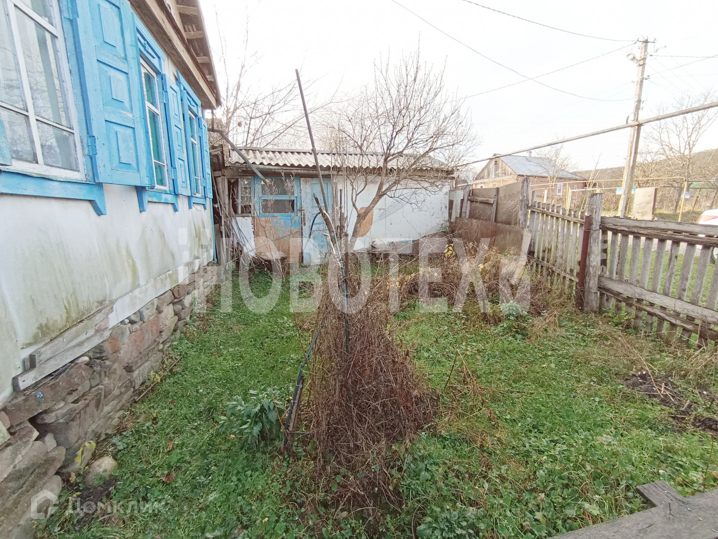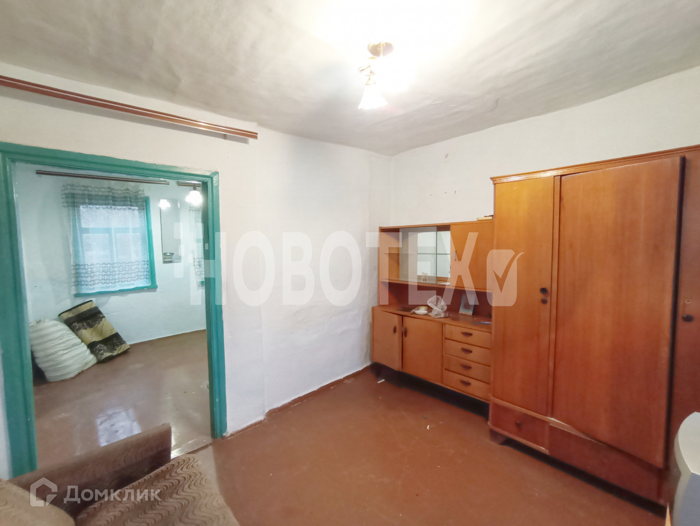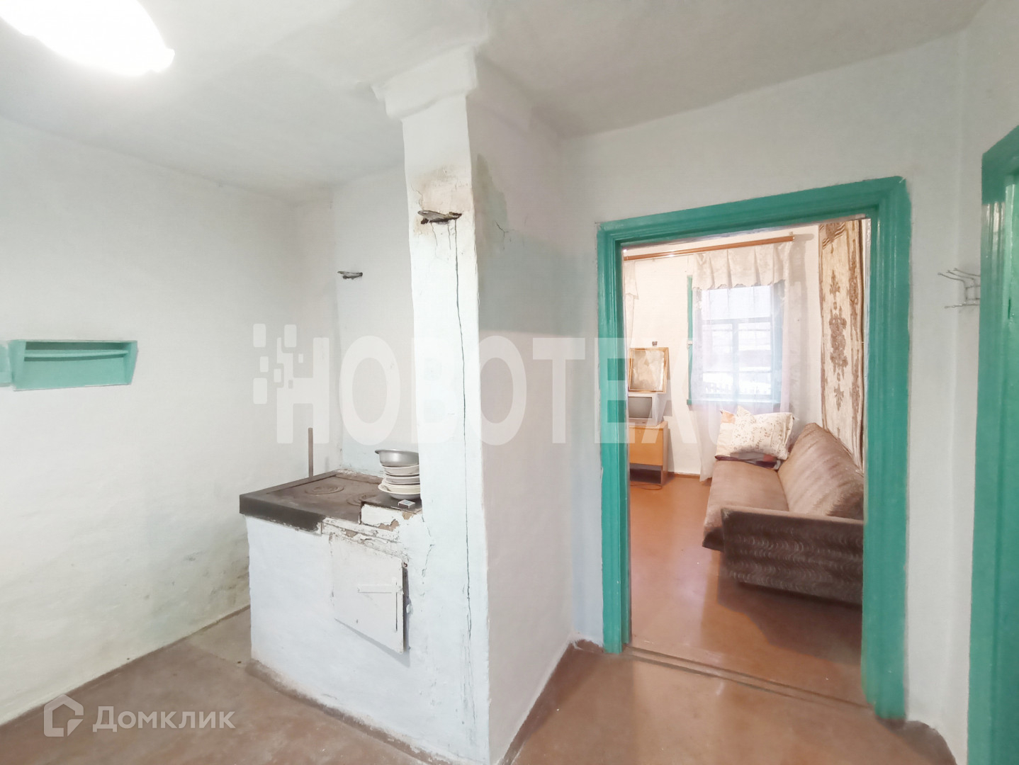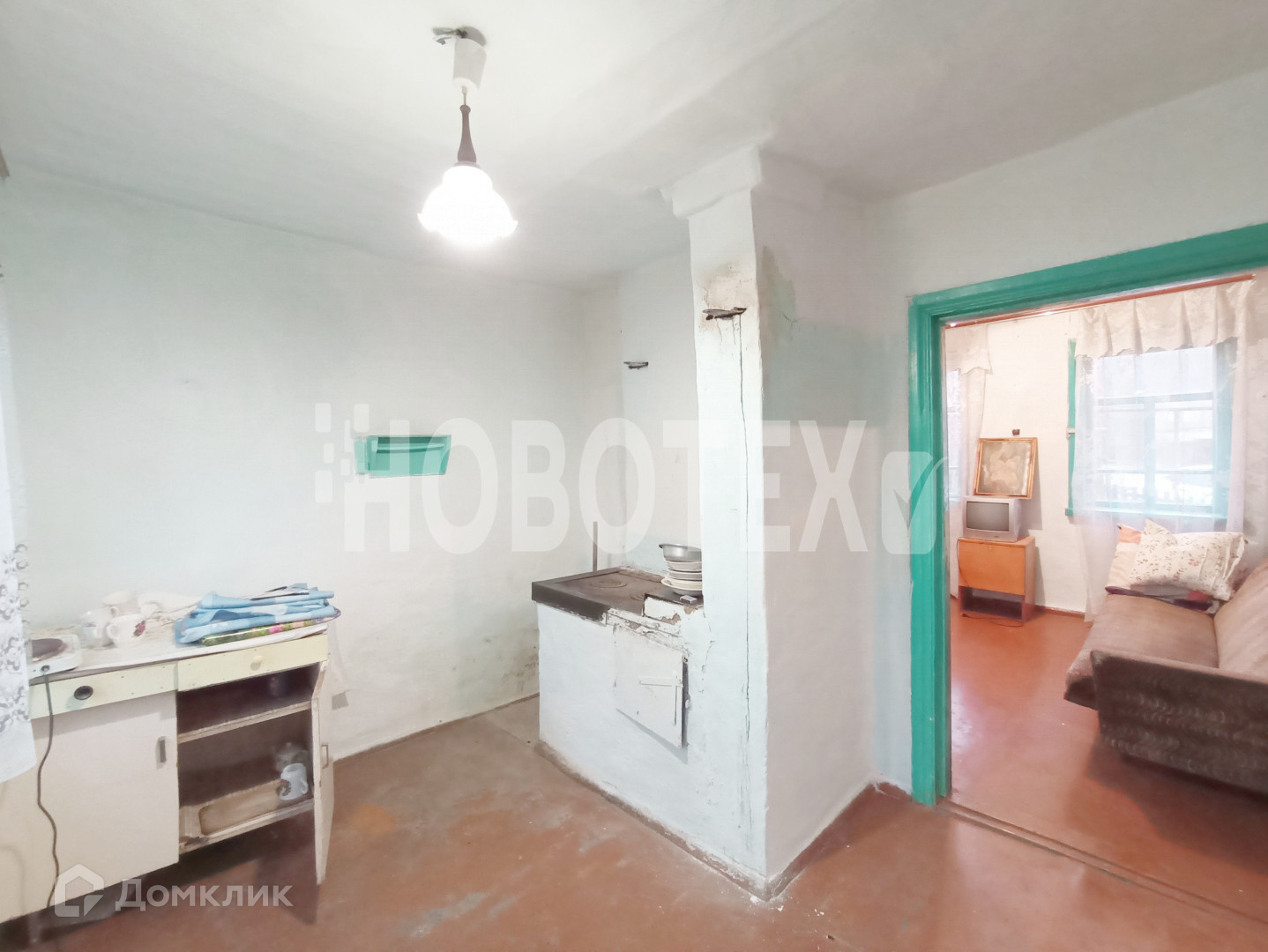 В доме 2 комнаты, кухня, прихожая, кладовая. Стены побелены, на полу  ДВП. Действующая печка.