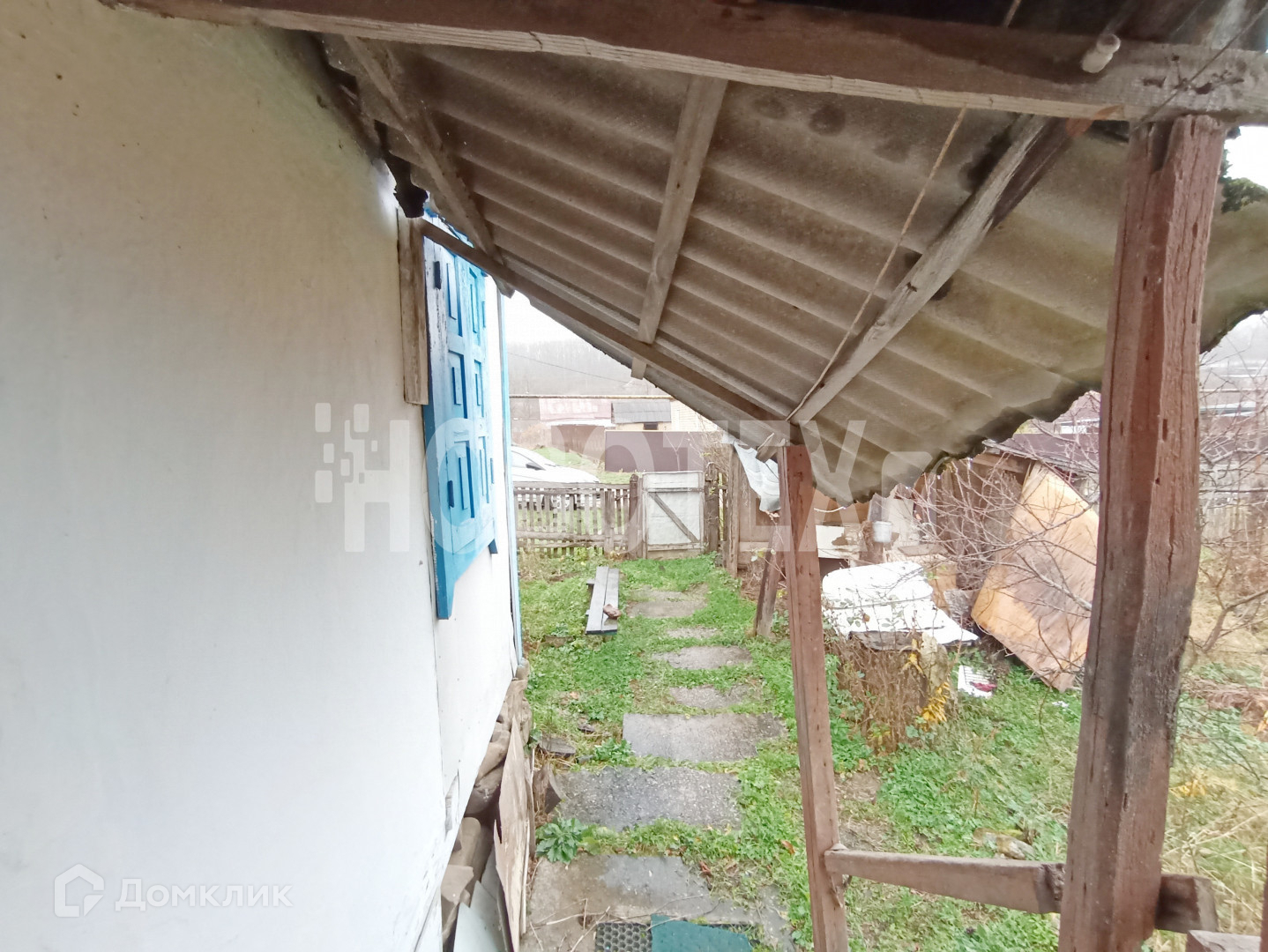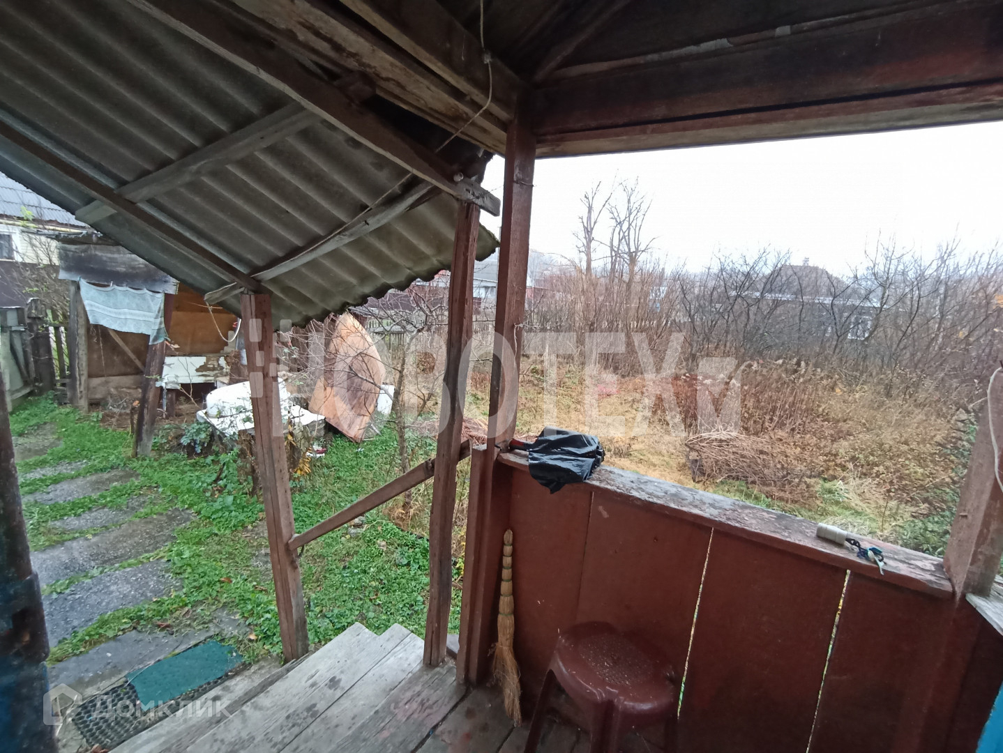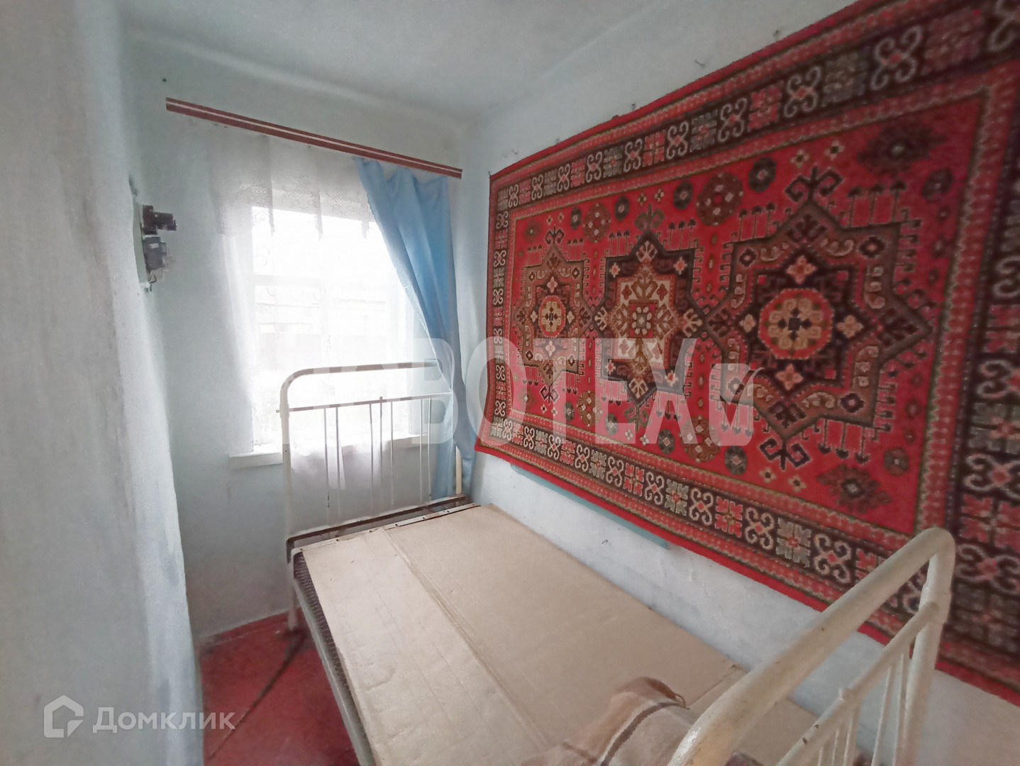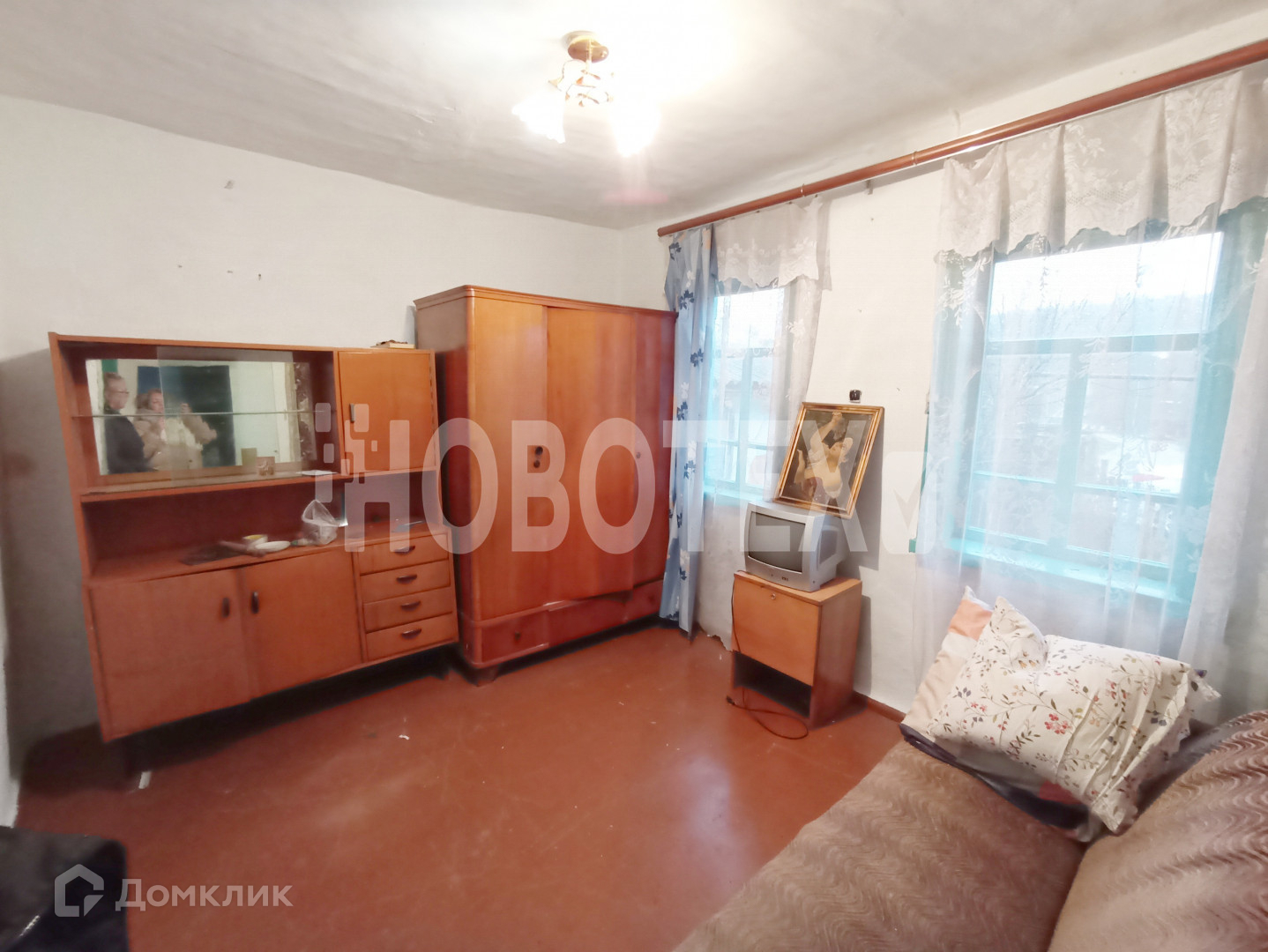 В доме 2 комнаты, кухня, прихожая, кладовая. Стены побелены, на полу  ДВП. Действующая печка.