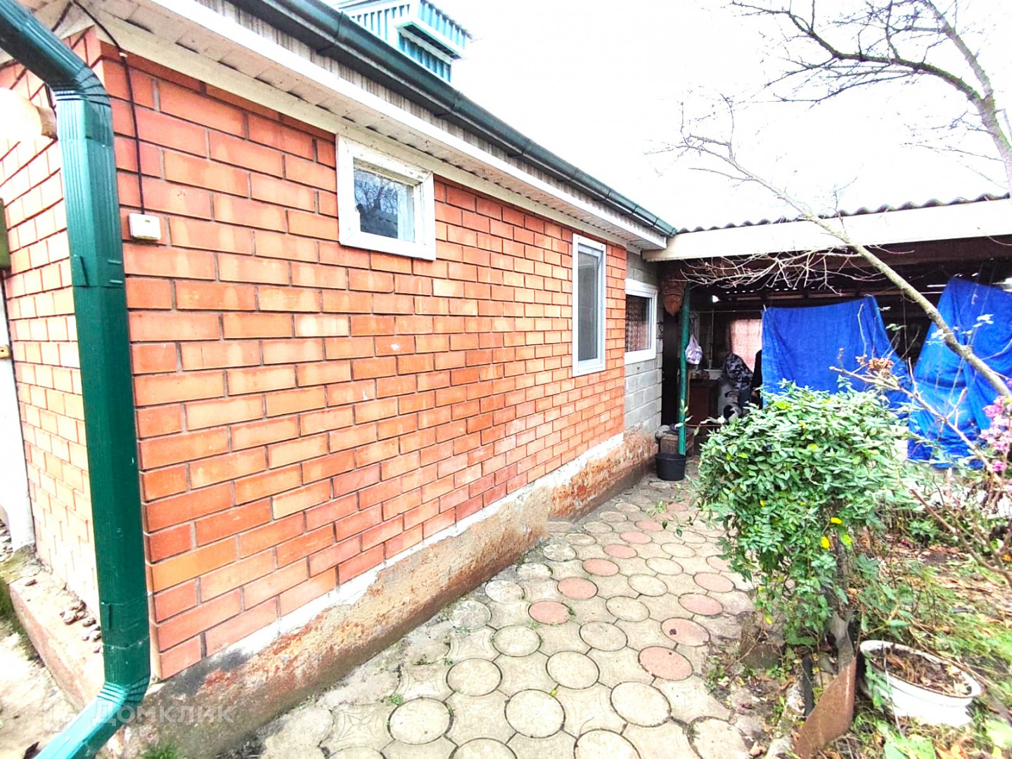 Парковочное место для автомобиля, навес, двор вымощен тротуарной плиткой, кирпичная баня на дровах.