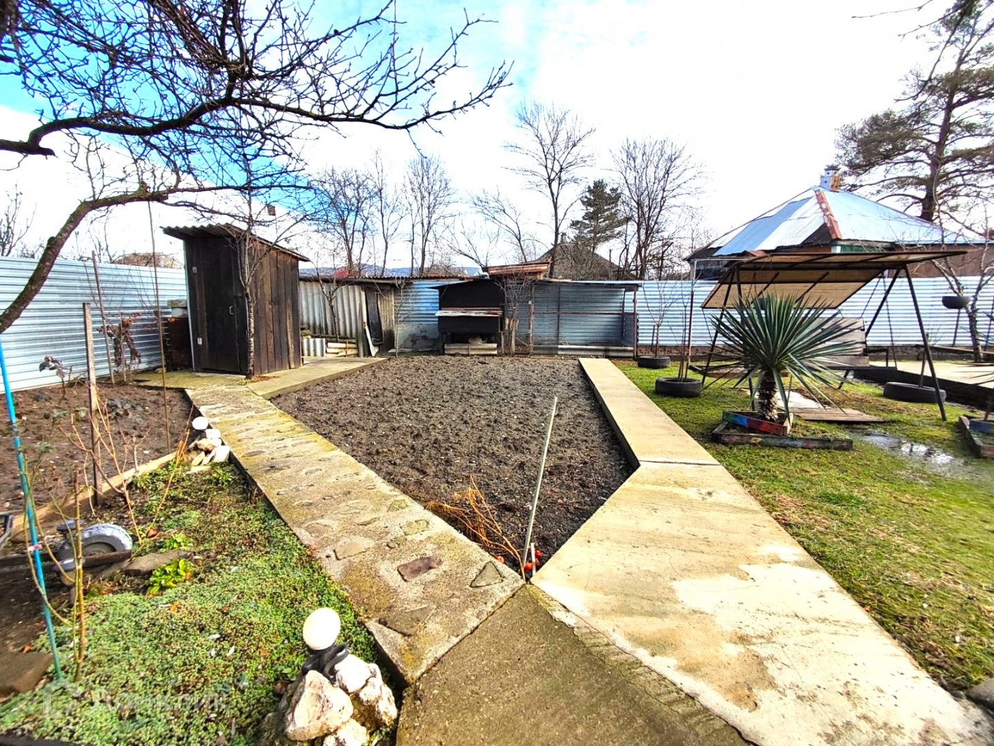 Ухоженный участок с множеством плодовых деревьев (яблони, вишня, персик, груша), виноградник.