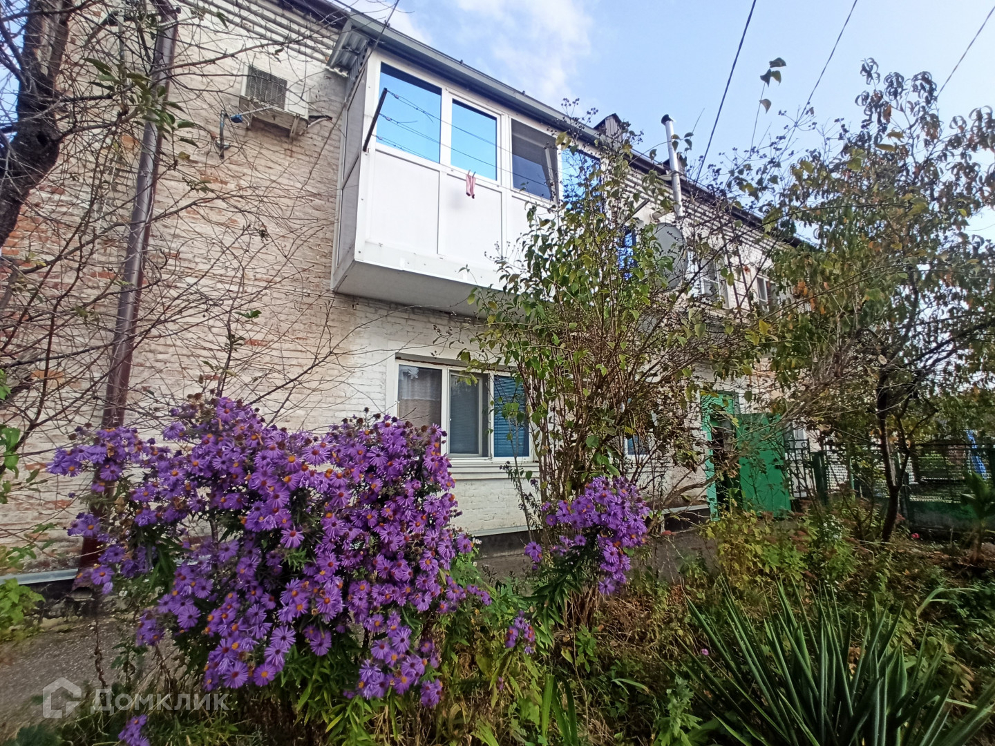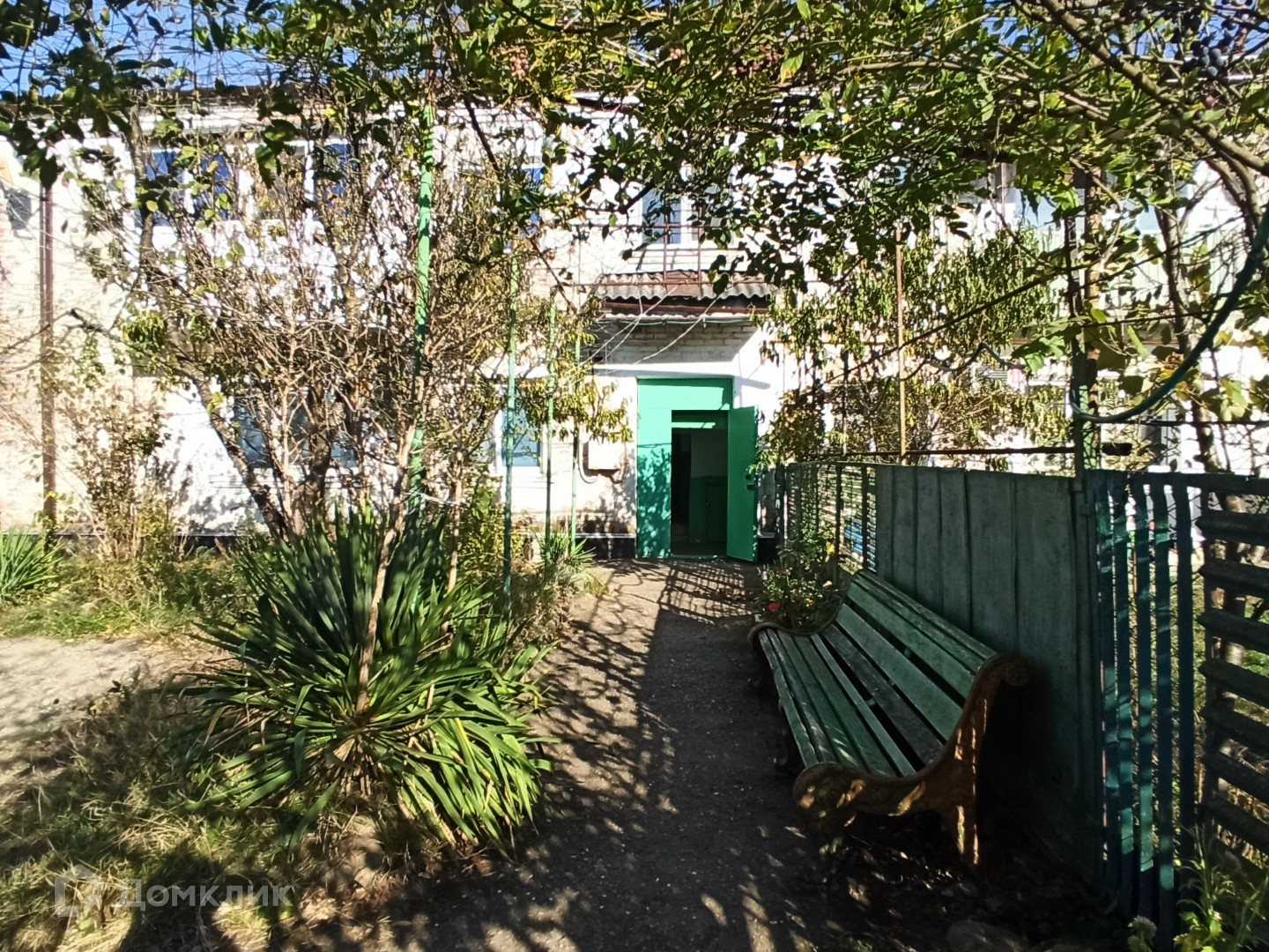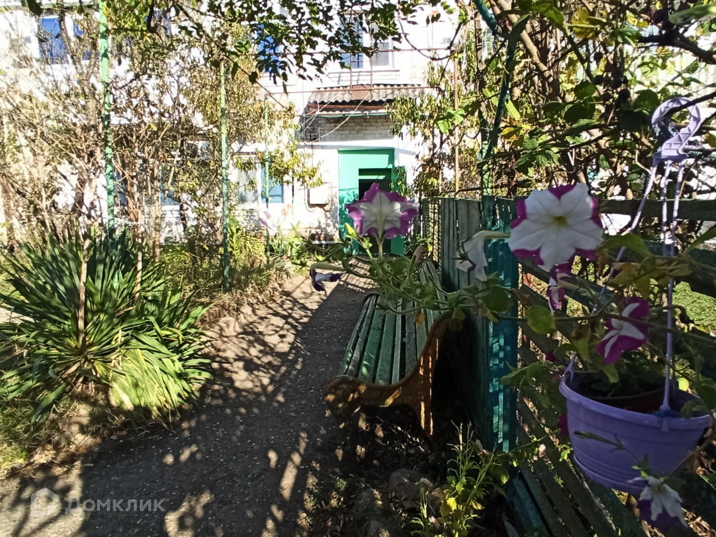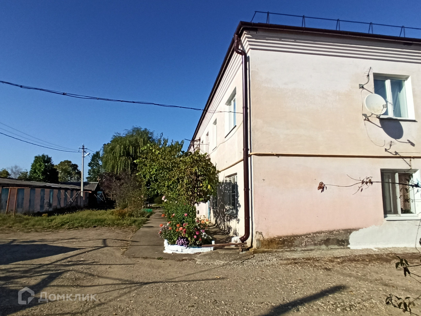 Дружный восьмиквартирный дом с новой крышей из металлопрофиля ждет жильцов в квартиру на втором этаже. Во дворе вас ждут лавочки для посиделок с соседями, вокруг которых жильцы высаживают цветы и расставляют кашпо с растениями.