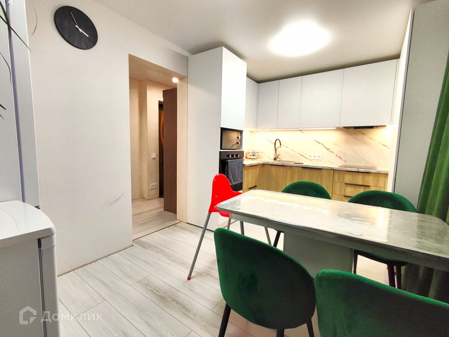Сделан ремонт - выровнены стены, заменена электропроводка, коммуникации, установлена система "теплый пол". Качественная, современная кухня.