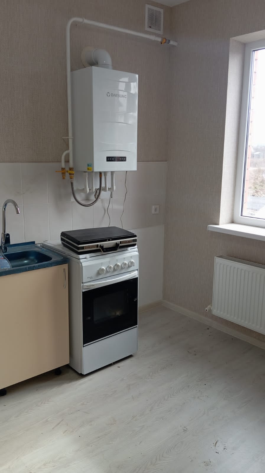 Район Немецкая Поляна. Продается угловая двухкомнатная квартира 48 кв.м. в новом кирпичном коттеджном доме на 5 хозяев. 1 этаж. 2 изолированные комнаты, совмещенный санузел, большая кухня, коридор. Хороший ремонт, ламинат, кафель. Газ, свет, вода, септик. 10 минут до остановки маршрутки.
