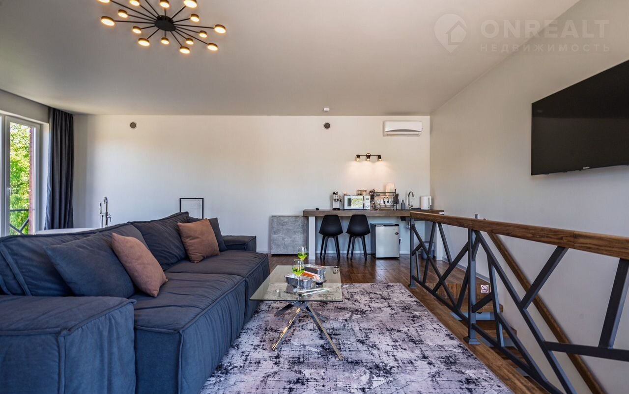 В другой спальной комнате-большая кровать и диван на два спальных места. Есть доп места в виде раскладных матрасов(2шт) . Мини кухня. Обеденный стол на 8 персон. Стиральная машина и гладильная доска,утюг.Свой сан узел,ТВ,сплит.